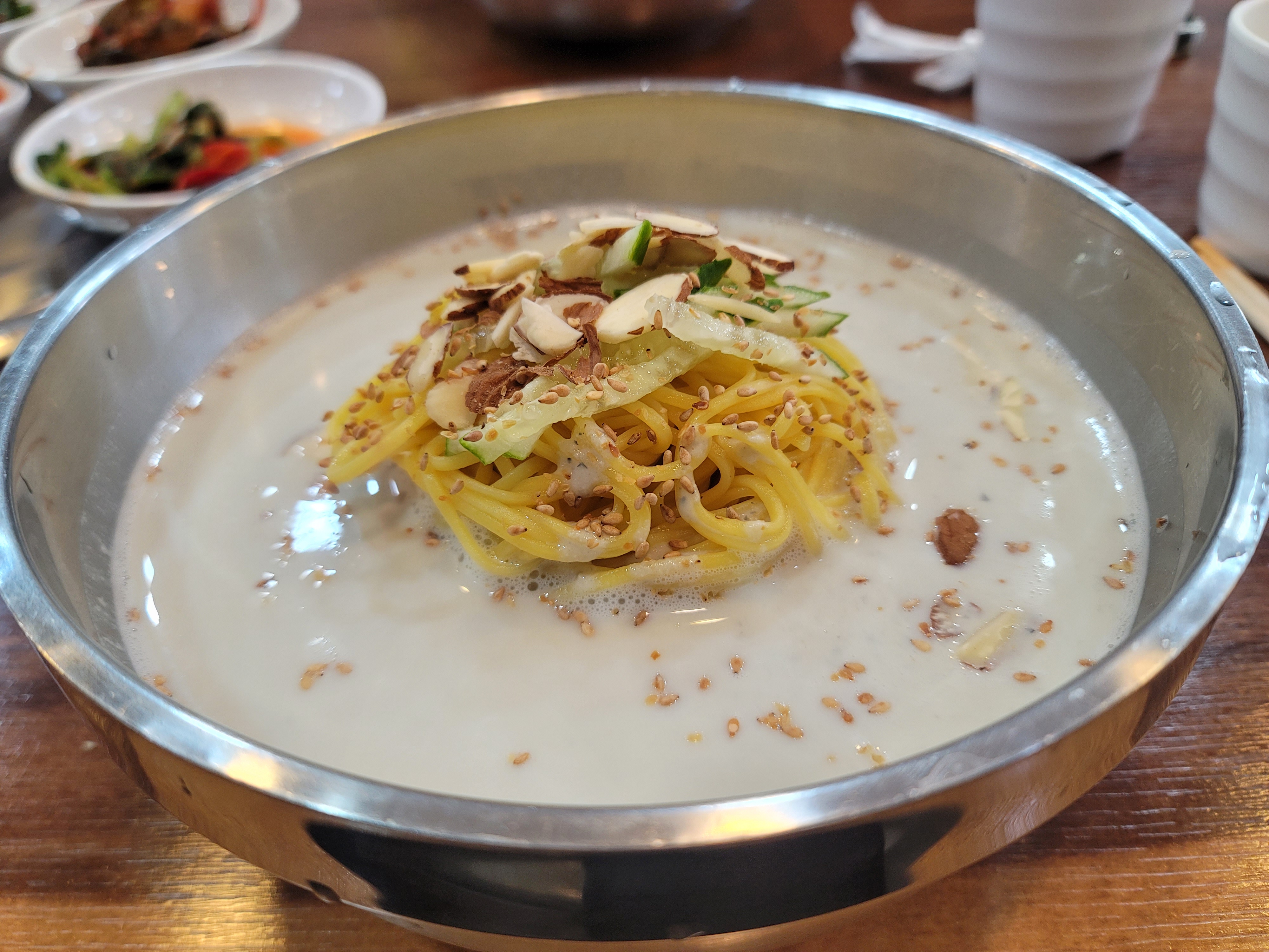 ○ 색상: 서리태의 검은 껍질 때문에 국물이 연한 회색을 띠며, 일반 콩국수보다 더 진하고 검은빛이 돕니다.