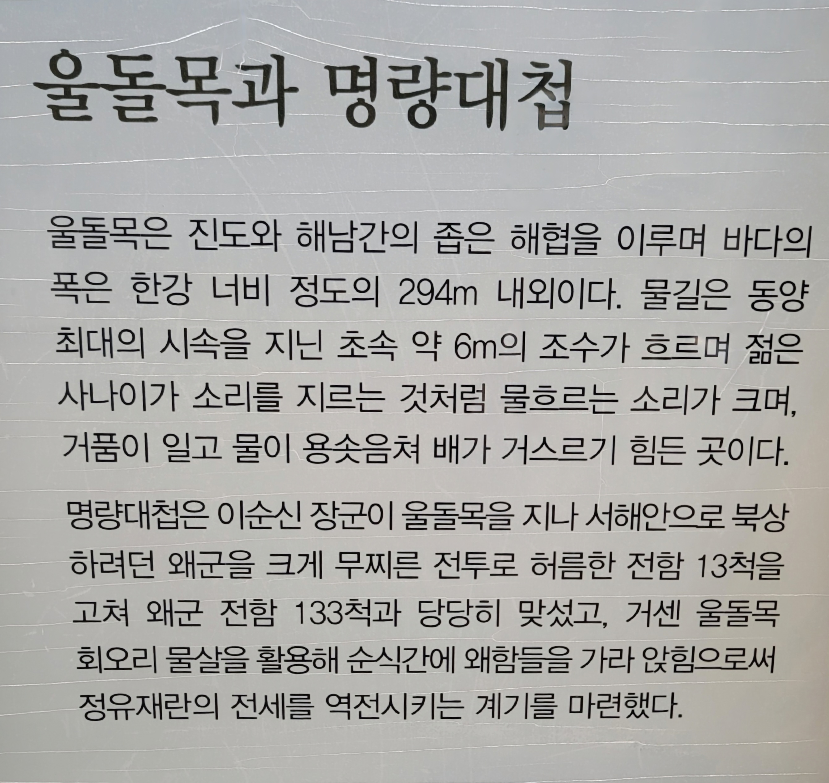 입장료는 성인 기준 1,000원. 명량해상케이블카 티켓 소지 시 무료입장 가능합니다.