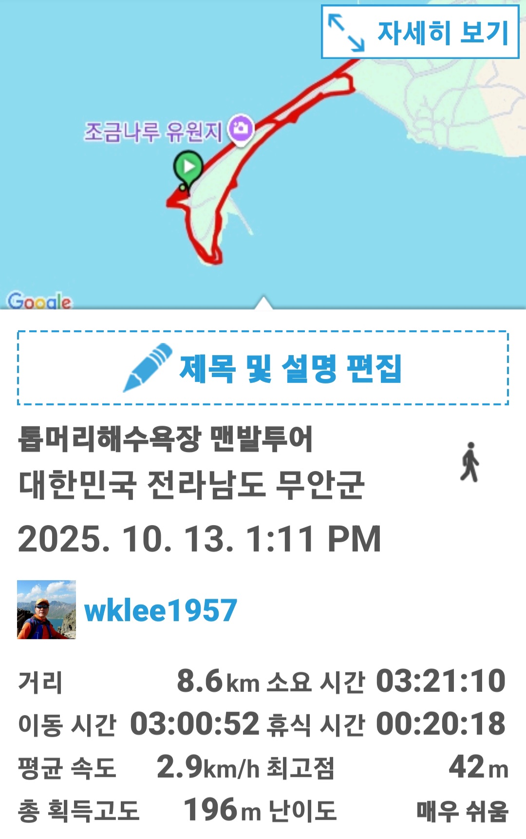구간은 무안군 운남면 연리 운남버스정류장에서부터 시작하여 무안군 현경면 용정리 봉오제 버스정류장까지 약 19.6km, 약 6시간 30분이 소요됩니다.