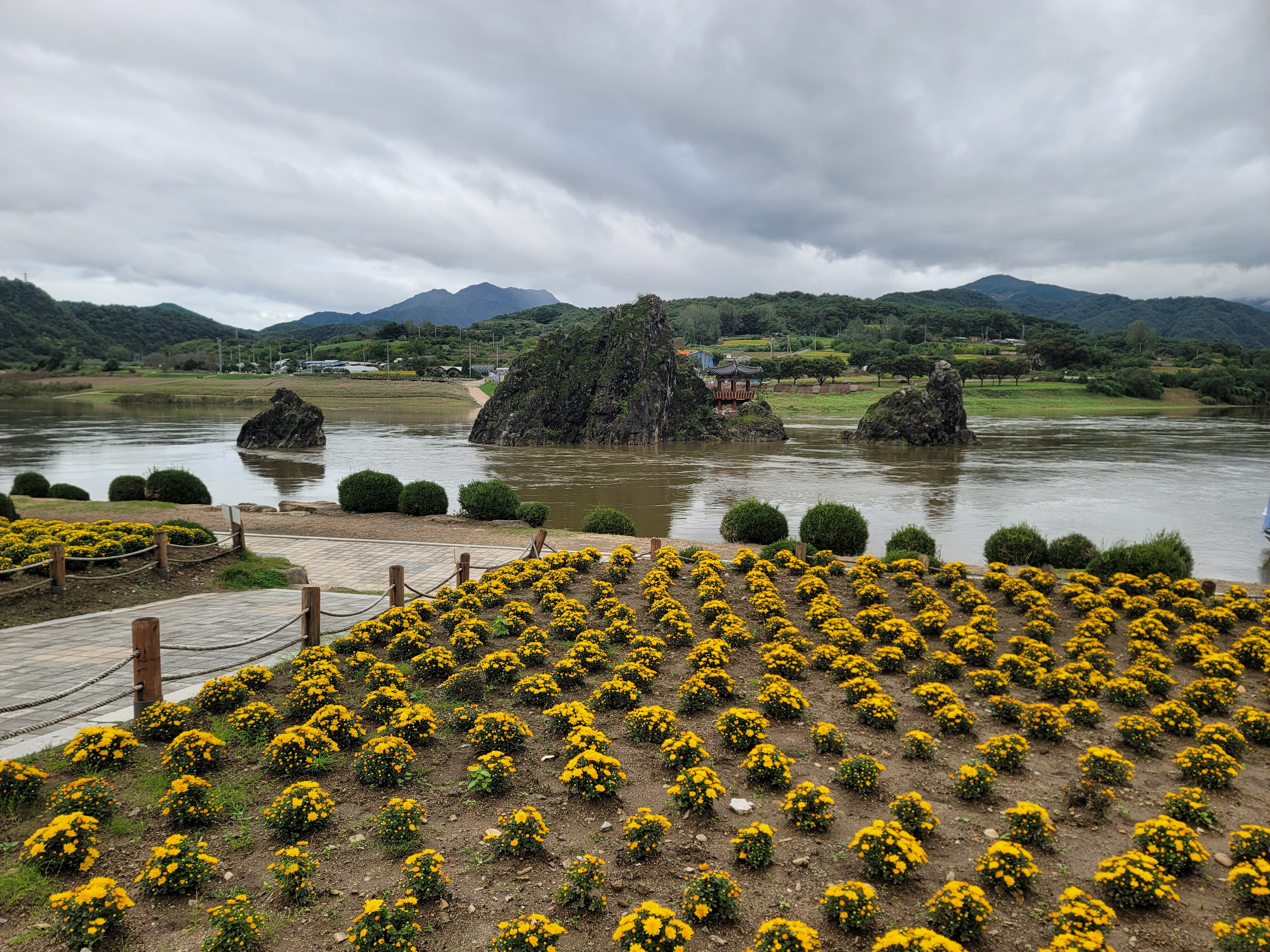 도담정원은 황화 코스모스 식재지로 유명하다. 도담삼봉의 풍경과 함께 자연의 아름다움을 한껏 느낄 수 있다.