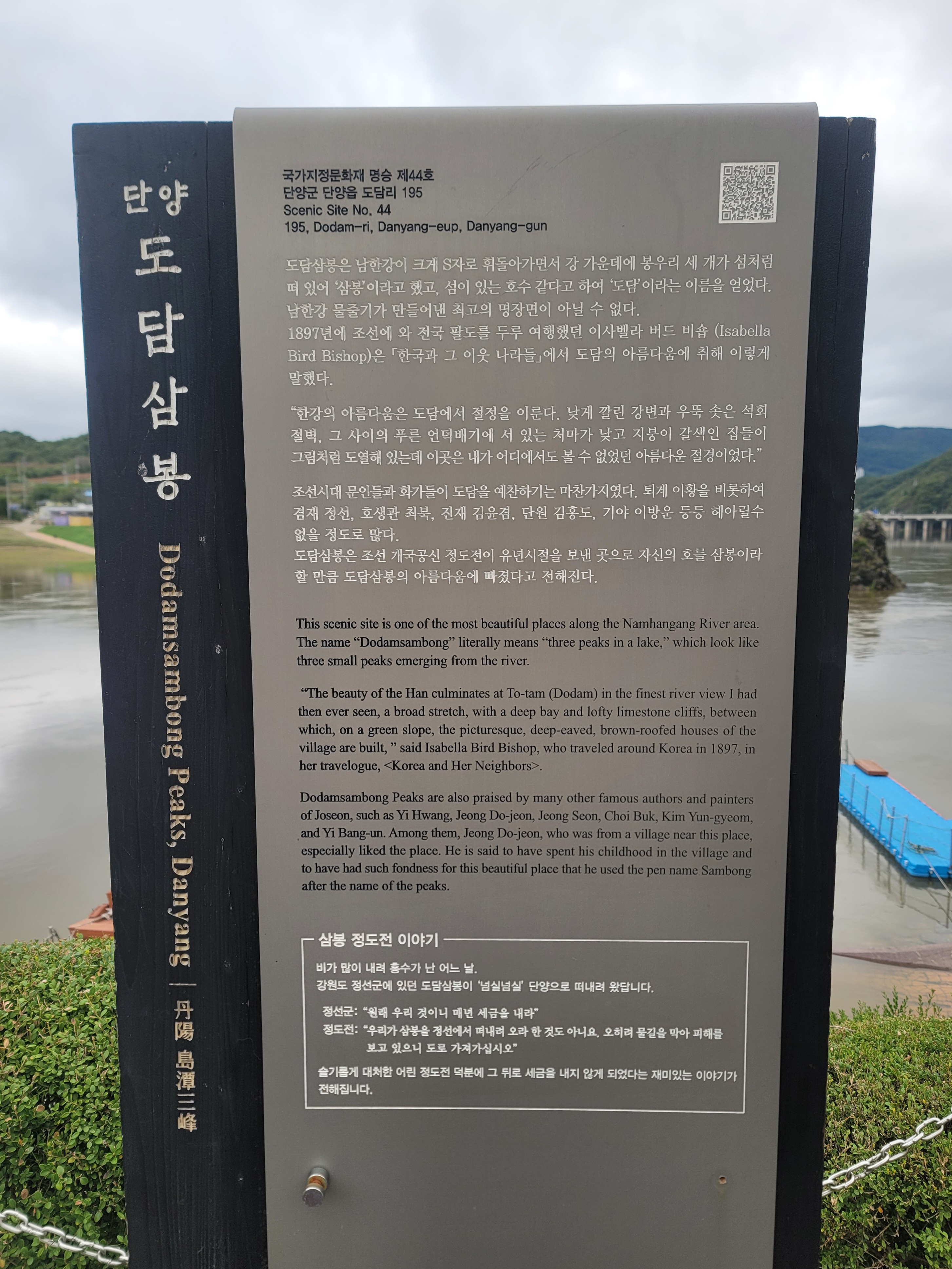 도담삼봉은 조선 개국에 공을 세운 정도전이 유년시절을 보낸 곳으로 자신의 호를 삼봉이라 할 만큼 도담삼봉의 아름다움에 빠졌다고 전해진다.