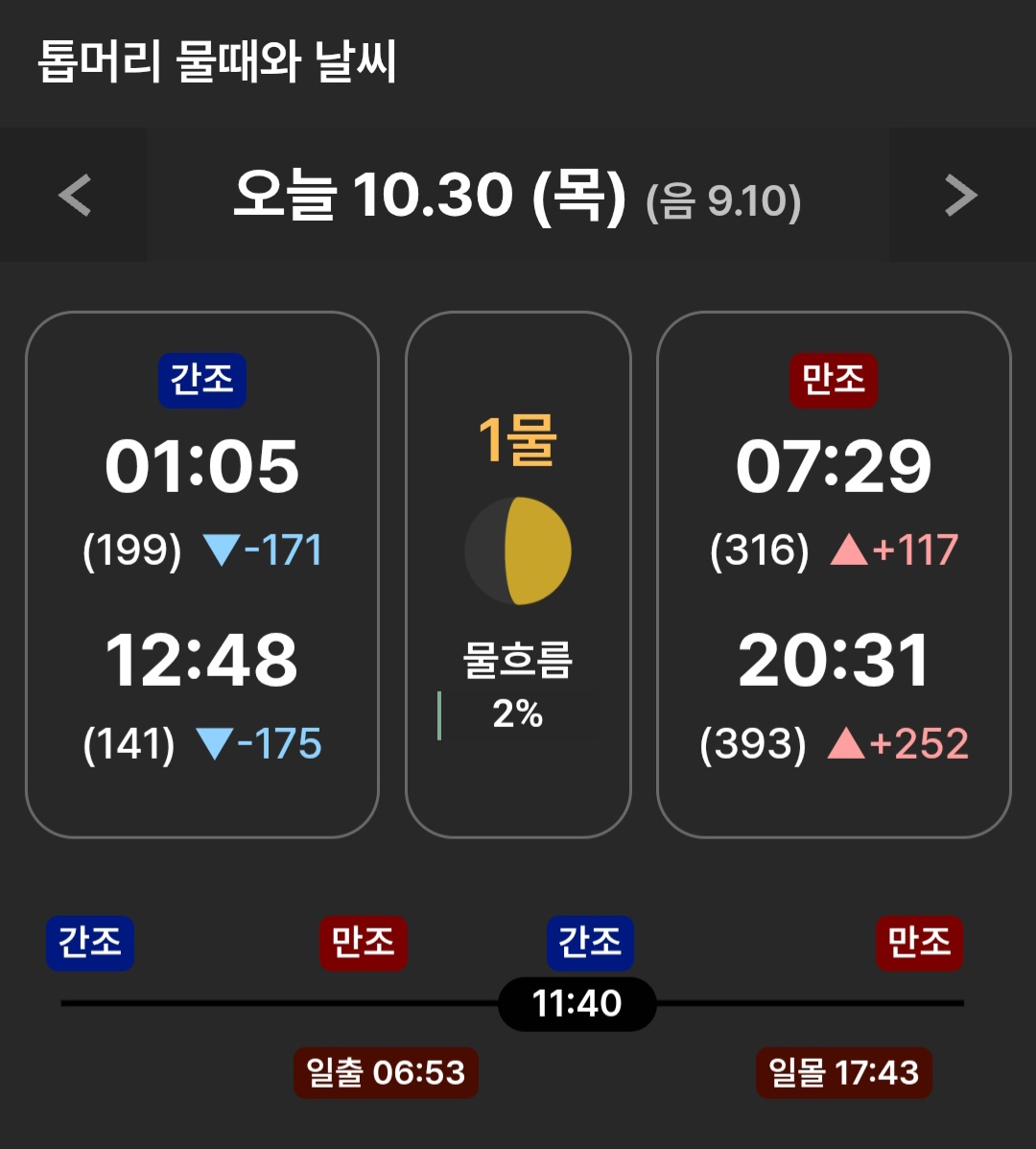 ○음력 기준: 물때는 달의 인력 변화에 따라 결정되므로, 보통 음력 날짜를 기준으로 합니다.