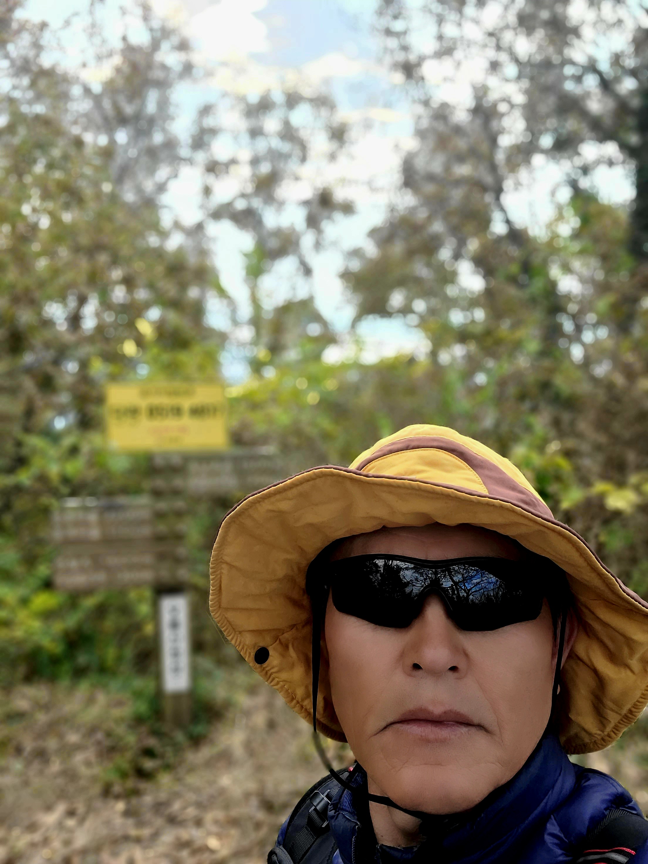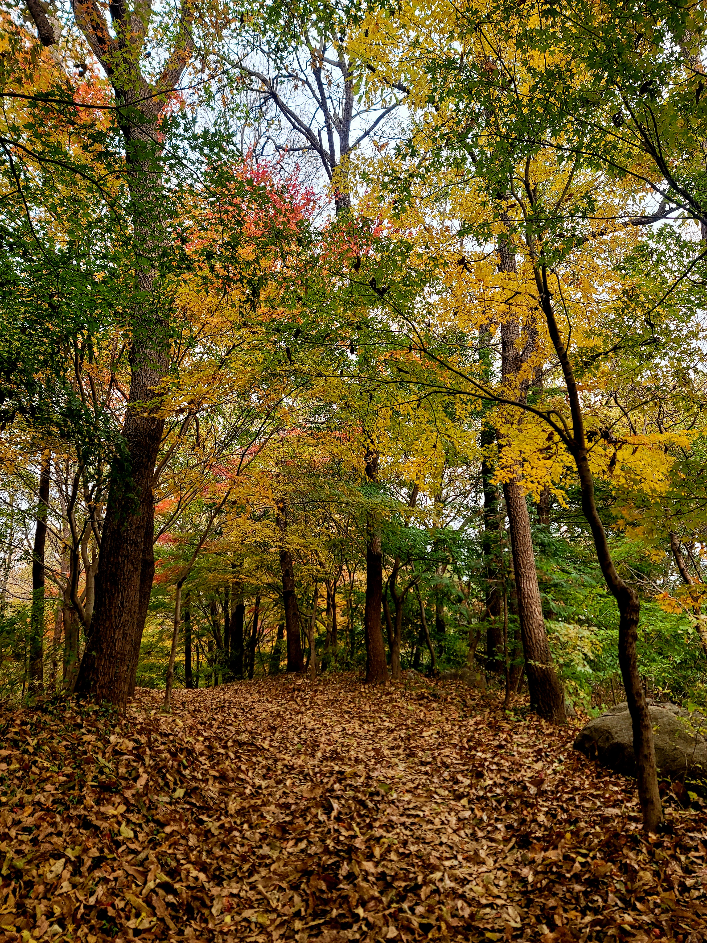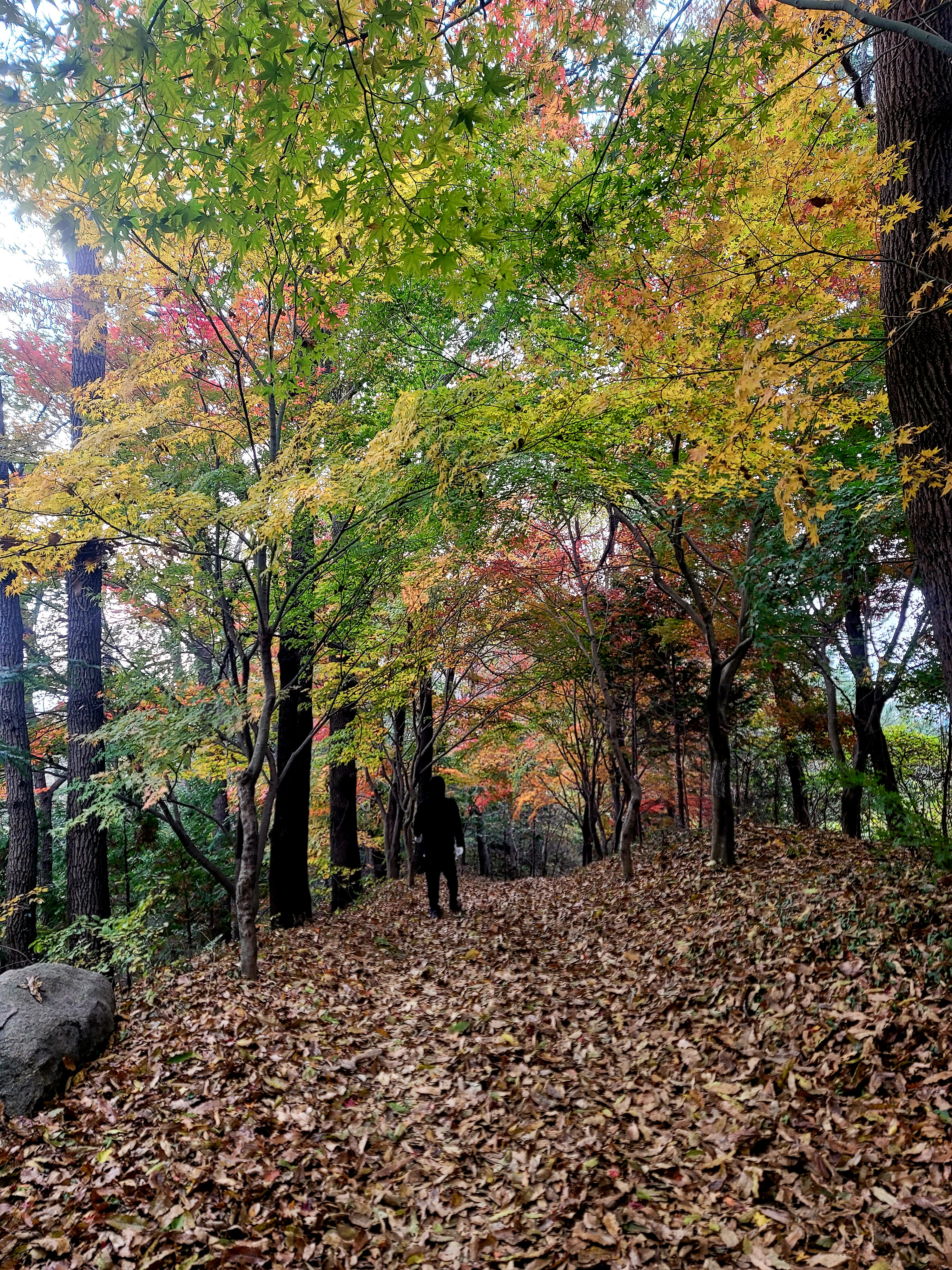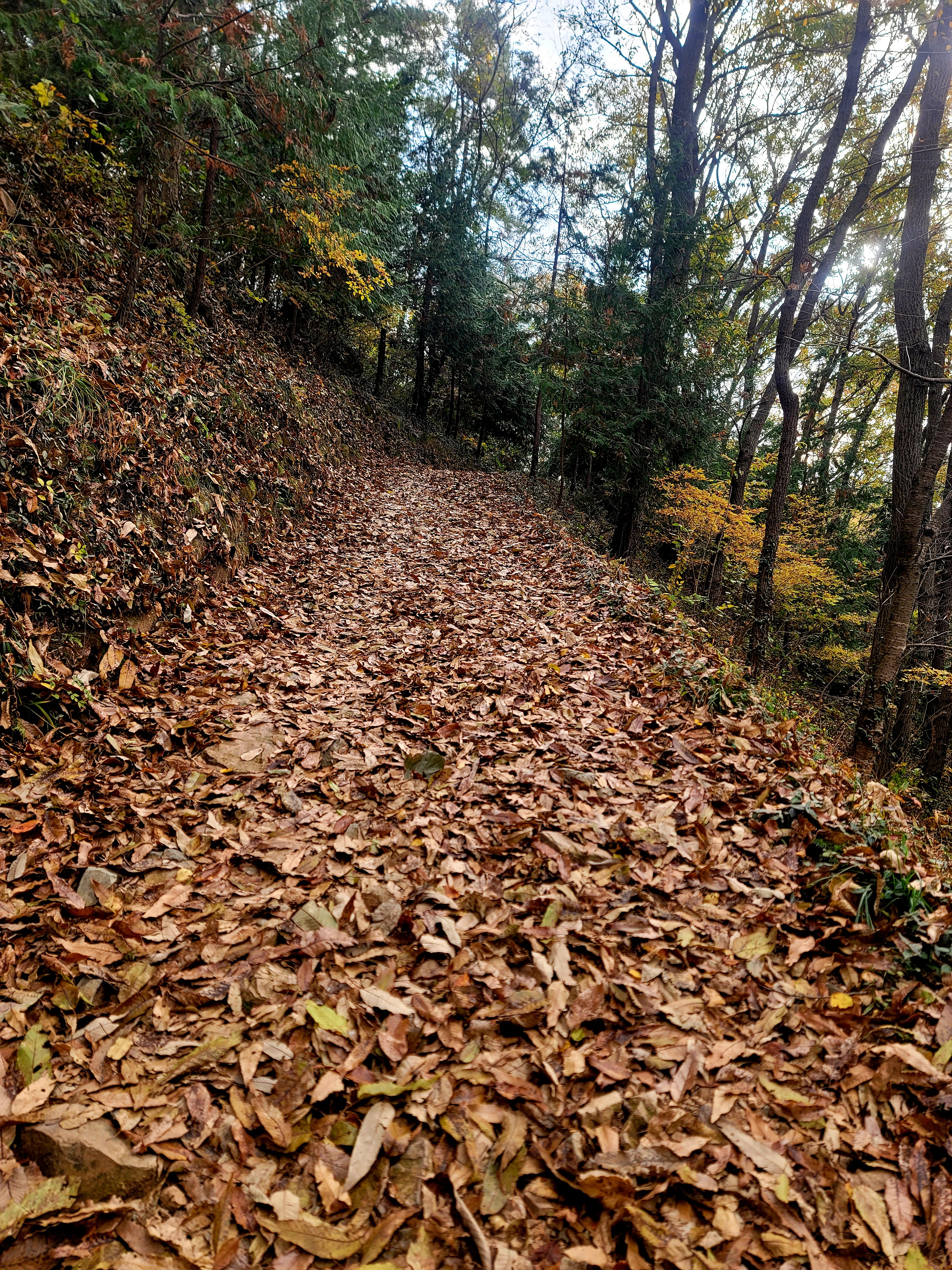 ○낙엽이 등로에 수북이 쌓여 맨발 걷기에 위험, 미끄러지지 않으려고 스틱을 사용하여 안전산행