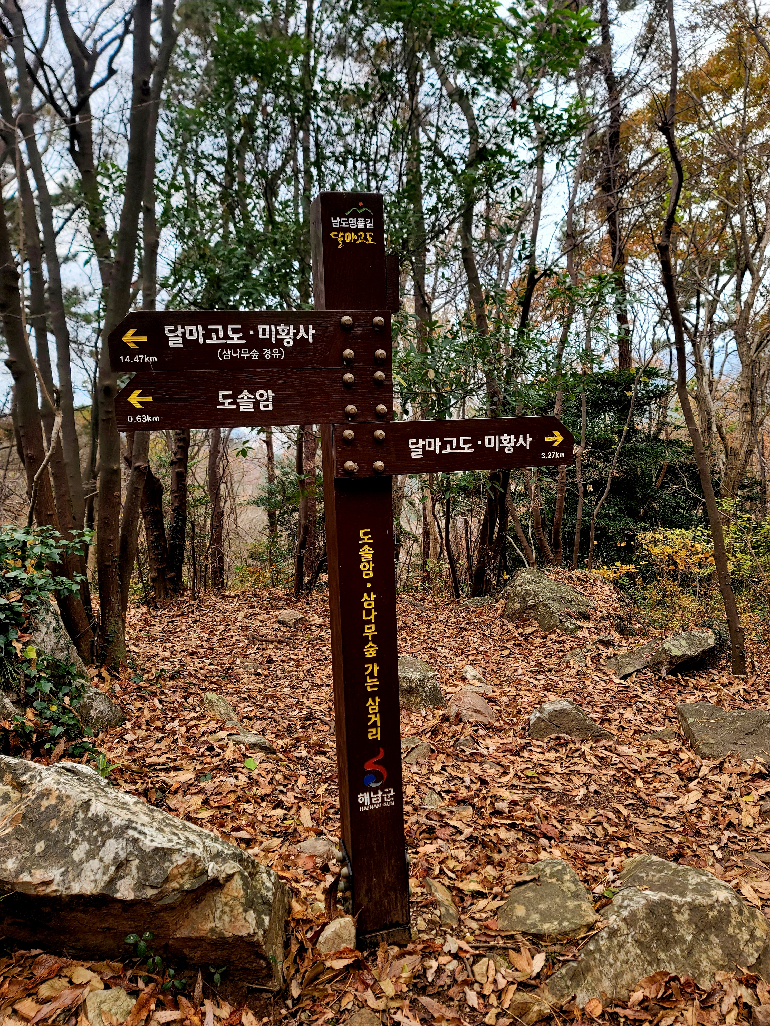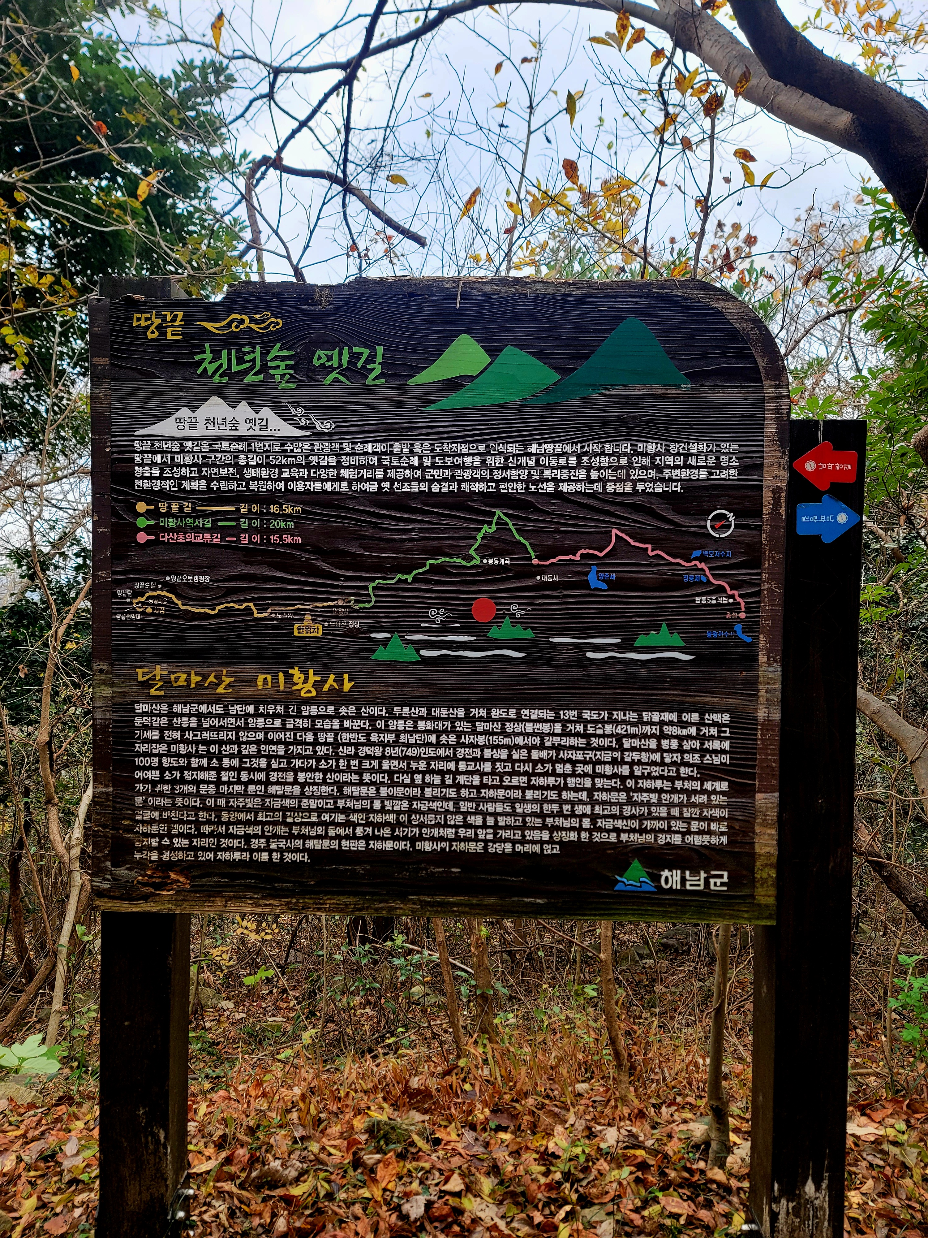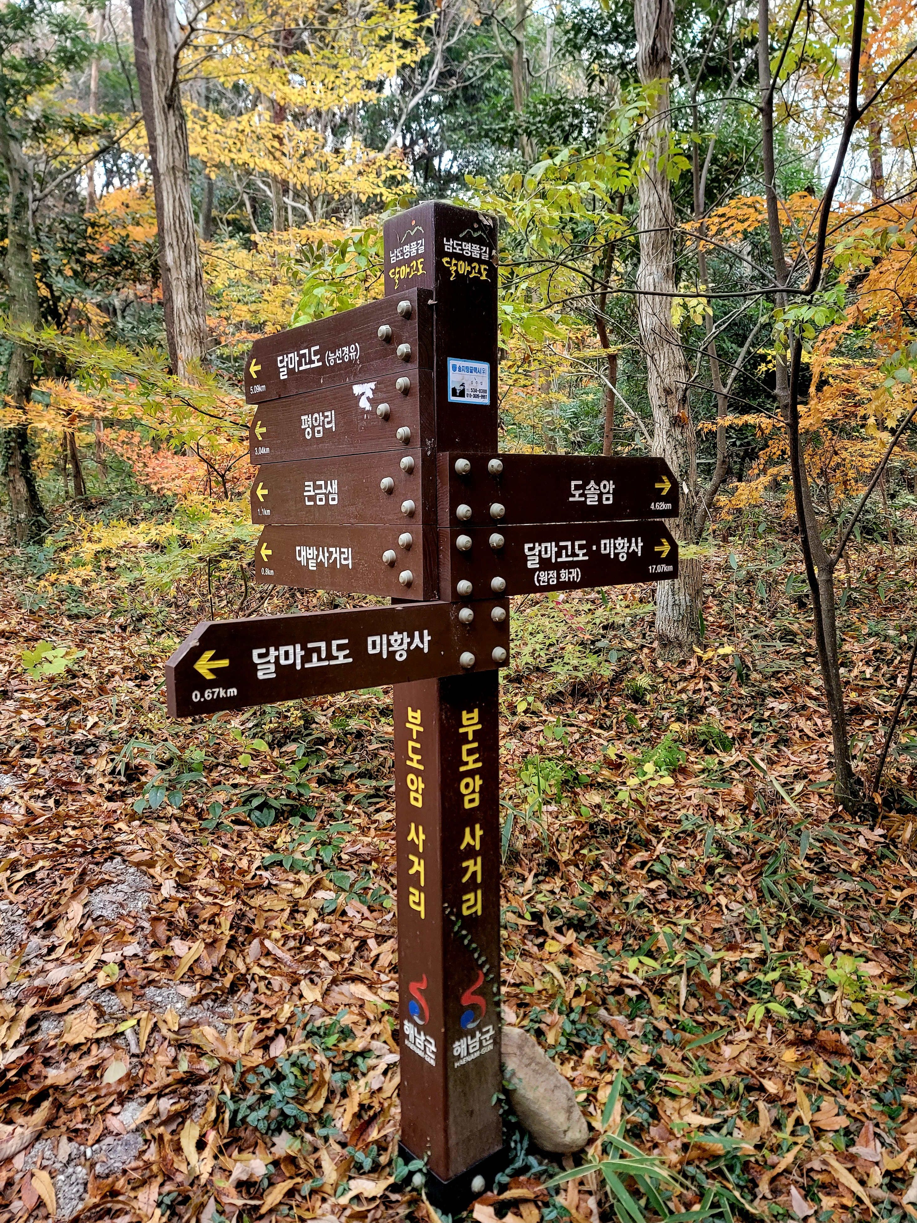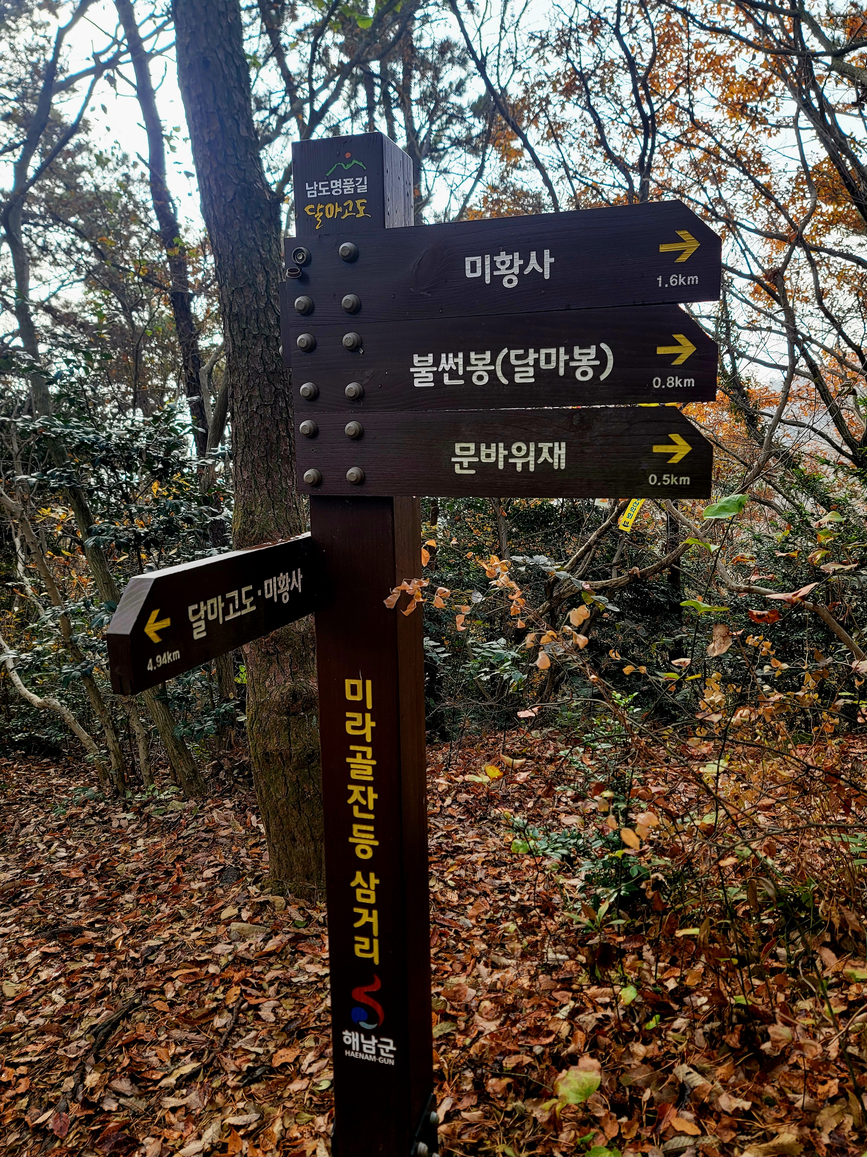 그러나 필자는 미황사~달마산 정상~달마고도~도솔암~미황사 코스를 맨발로 홀로 걸으며 단풍 구경도 실컷 하고 인증샷도 많이 남기면서 여유롭게 1시간 30분 전에 목적지에 도착하여 미황사도 전부 구경한 알찬 산행이었다.