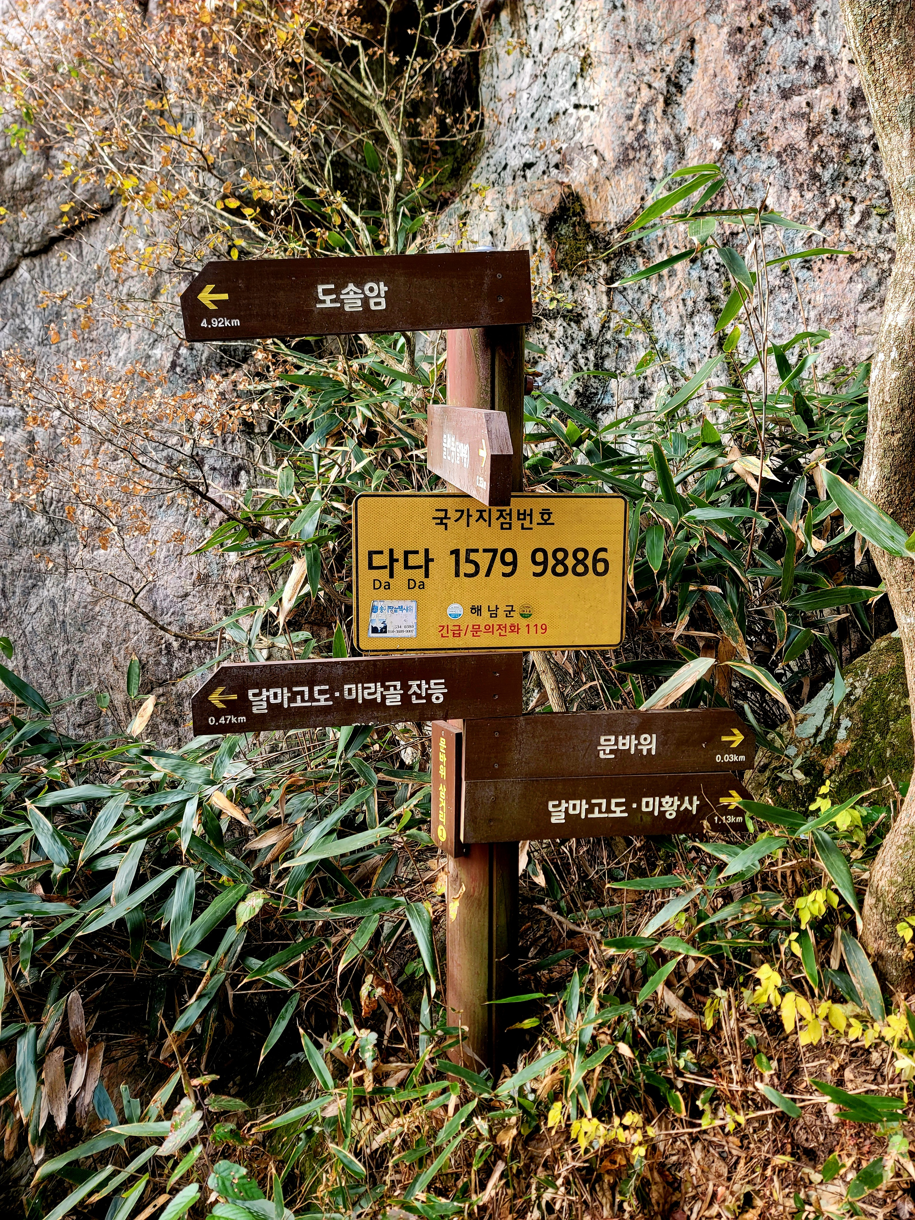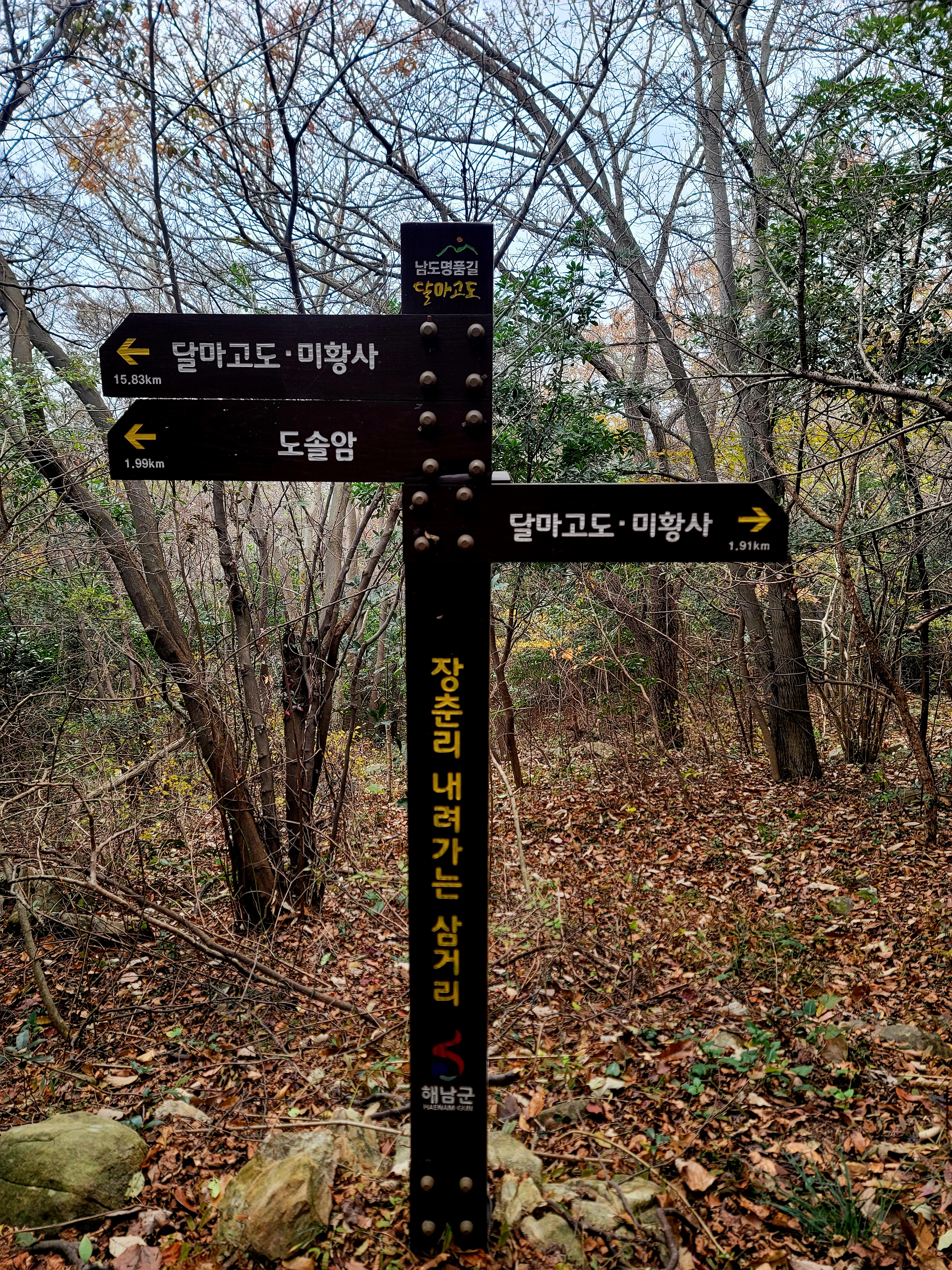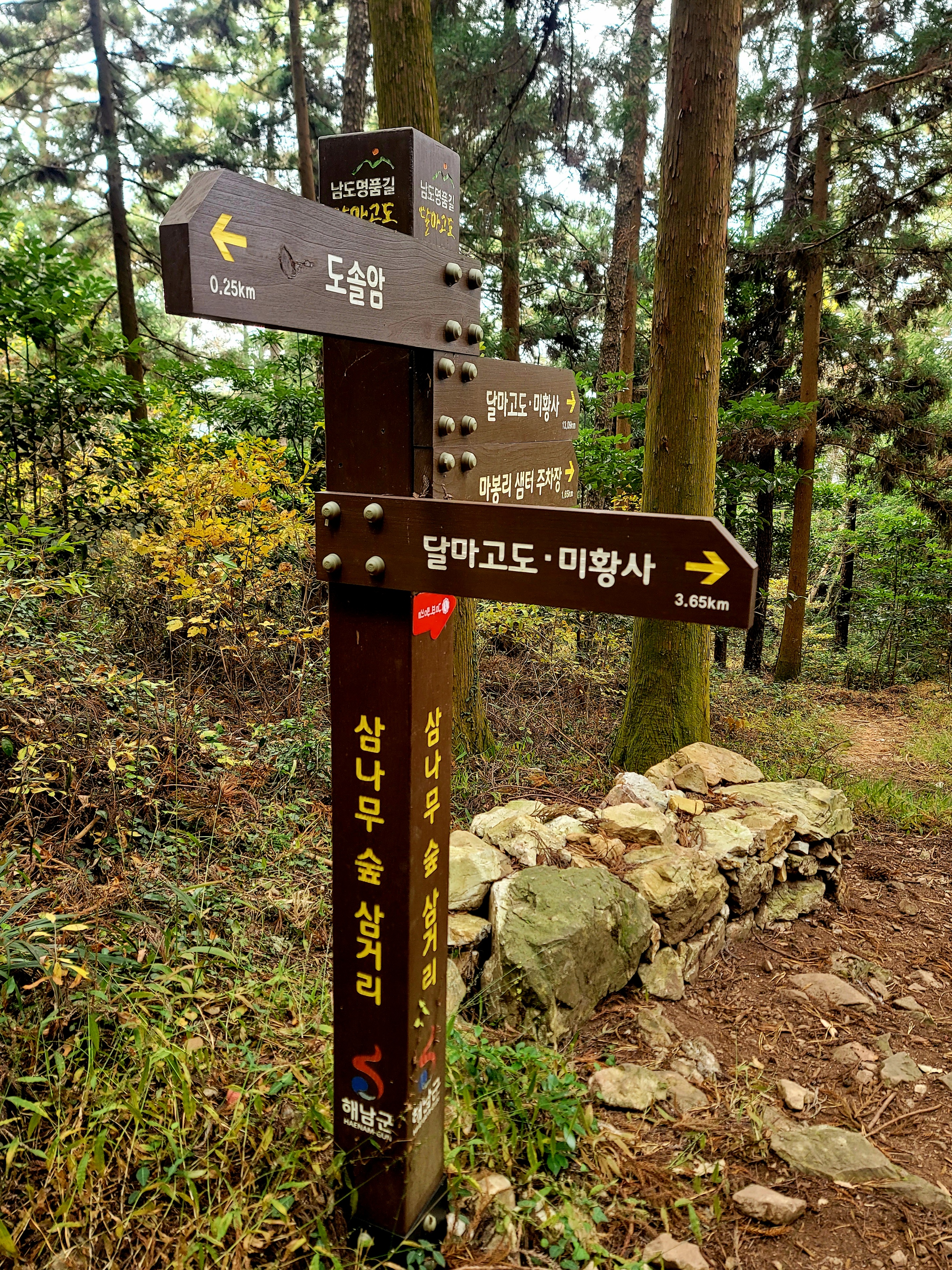그러나 필자는 미황사~달마산 정상~달마고도~도솔암~미황사 코스를 맨발로 홀로 걸으며 단풍 구경도 실컷 하고 인증샷도 많이 남기면서 여유롭게 1시간 30분 전에 목적지에 도착하여 미황사도 전부 구경한 알찬 산행이었다.