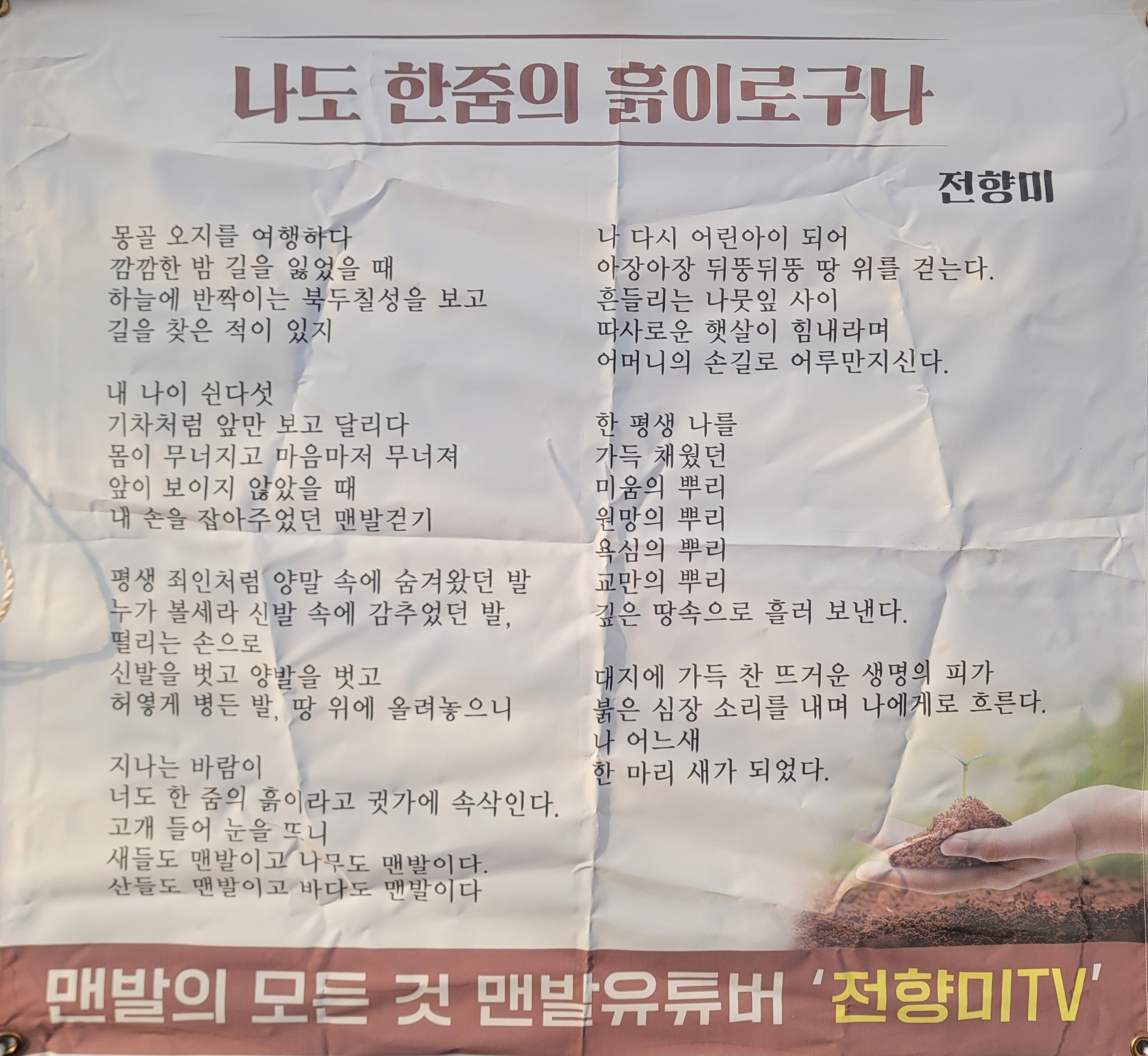 *맨발걷기는 깨달음과 깨우침입니다. 맨발로 걸으면서 자연의 이치를 터득하고 우리 몸의 구조를 이해하고 우리가 어떤 삶을 살아야 하는가를 생각하는 귀중한 시간을 제공하니까요. 이타행, 우분투, 홍익인간 정신의 구현이 멀리 떨어져 있는 것이 아니라 바로 내 안에 있다는 사실의 자각입니다.