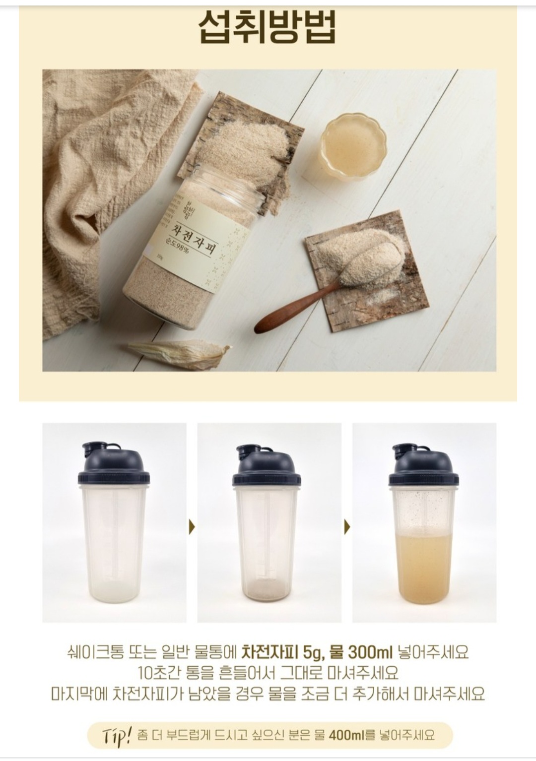 차전자피는 물에 닿는 순간 젤리처럼 걸쭉하게 변하기 시작하므로, 물에 타서 즉시 마시는 것이 중요합니다.