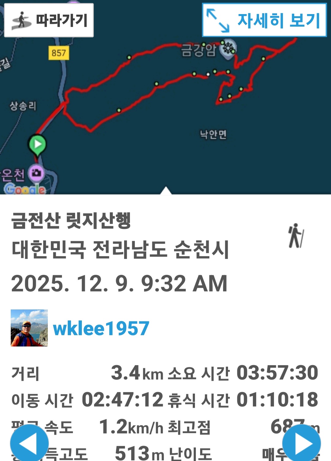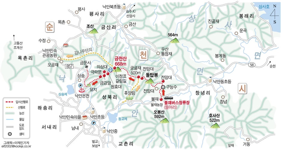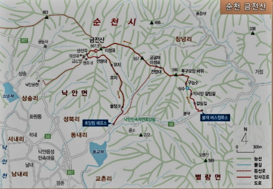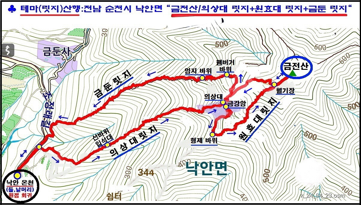 ■ 산행코스: 낙안 온천 - 입석대/선 바위 - 의상대 릿지 - 의상대/금강암 - 형제 바위 - 원효대 릿지 - 헬기장 - 금전산(왕복) - 햄버거/삼각바위 - 엄지 바위 - 금둔 릿지 - 낙안 온천 (원점 회귀)