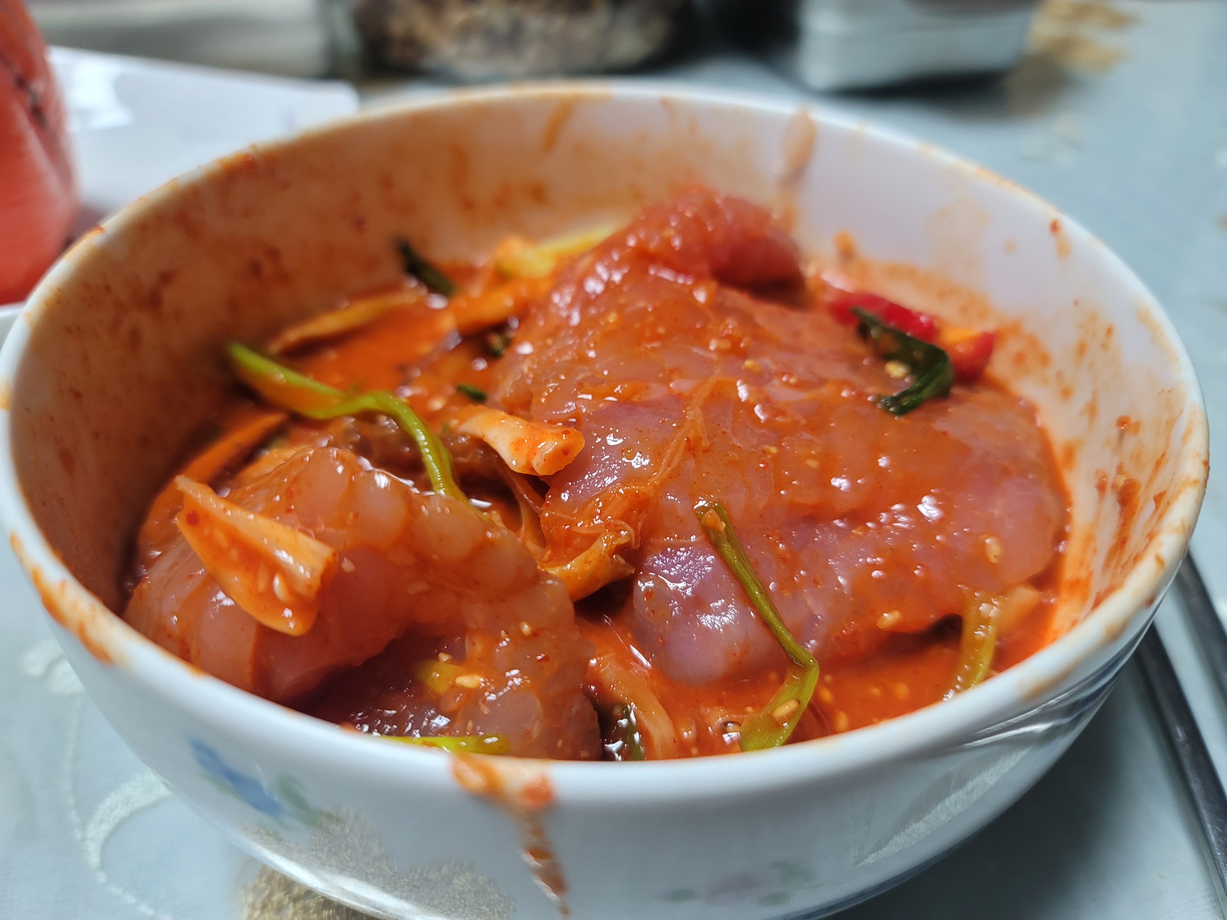 ○무치기: 고추장 베이스의 양념에 홍어, 오징어, 절인 야채를 넣고 색이 잘 배도록 살살 무쳐줍니다.