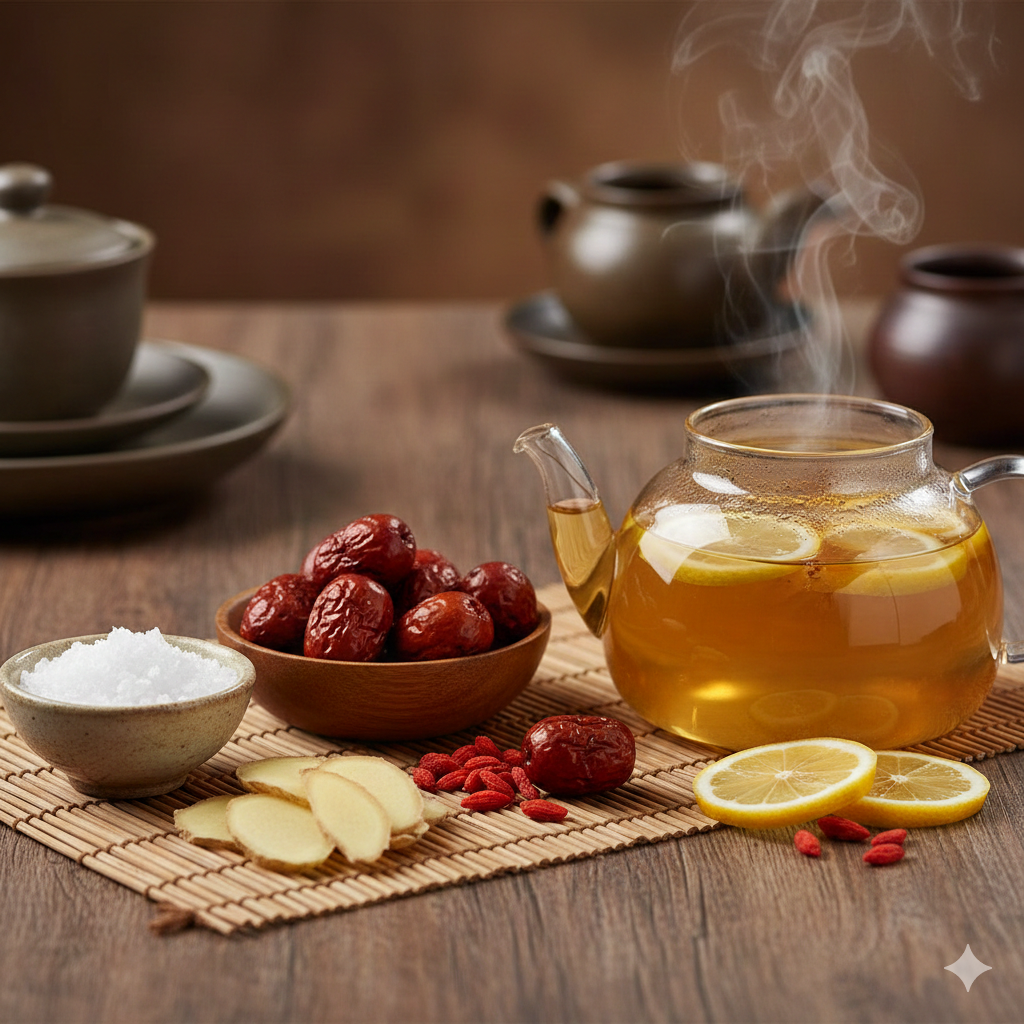 기존의 생강, 대추, 구기자, 레몬 조합에 **'소금'**이 한 꼬집 들어가면 단순히 맛을 내는 것 이상의 특별한 효능이 더해집니다. 한방에서는 이를 '상화(相和)' 작용이라 하여 약성을 더 깊이 전달하는 방법으로 쓰기도 합니다.
