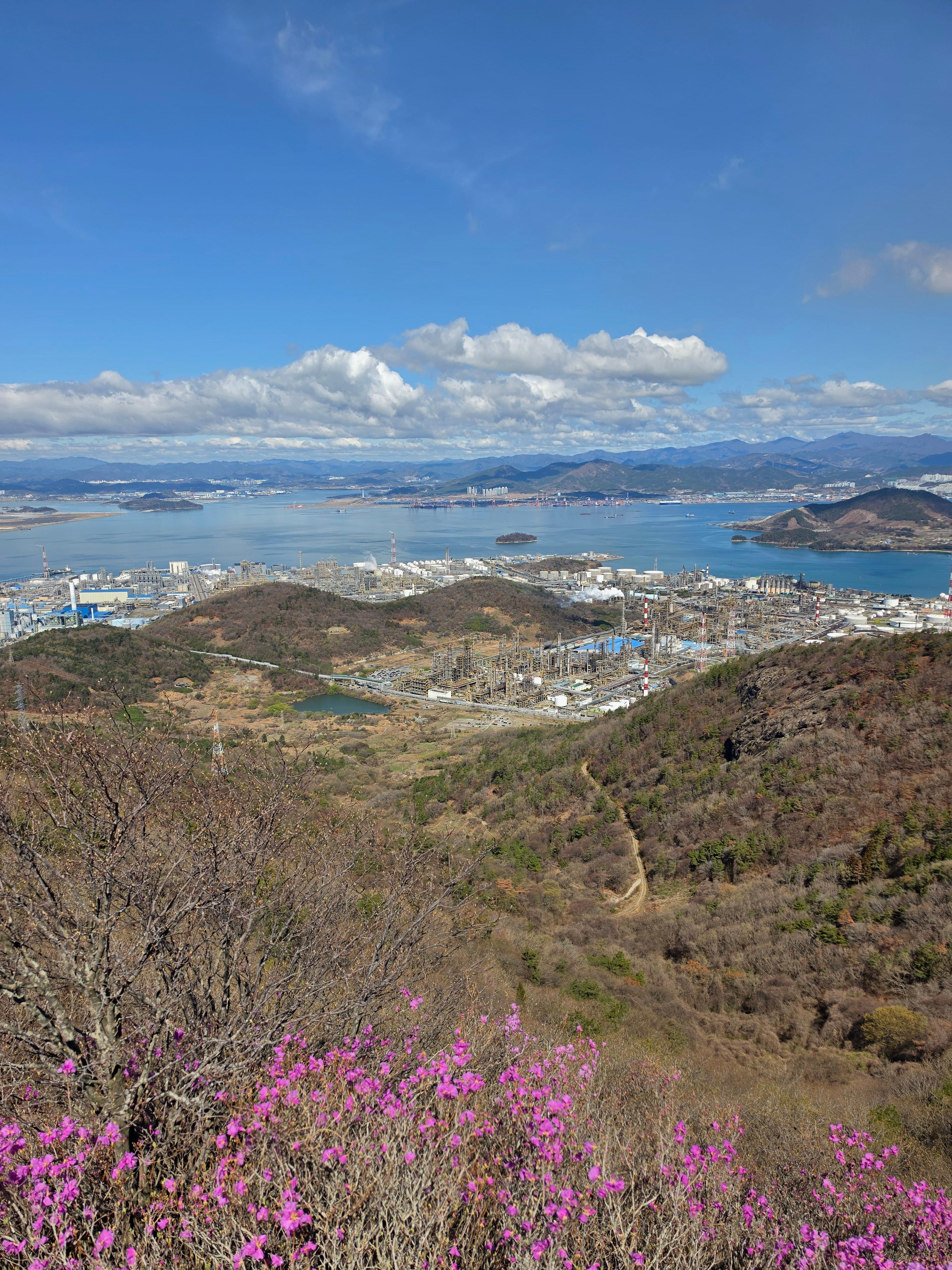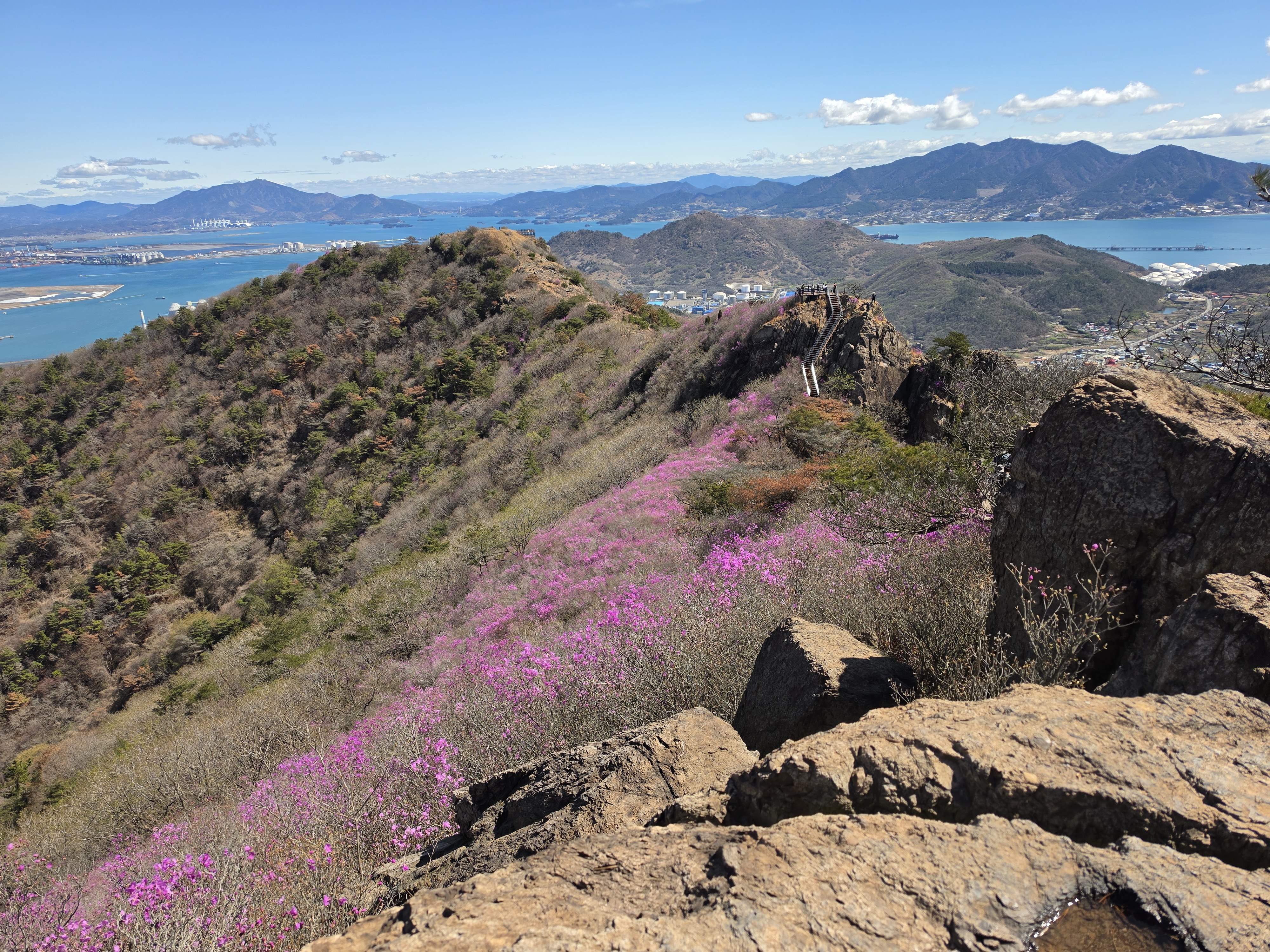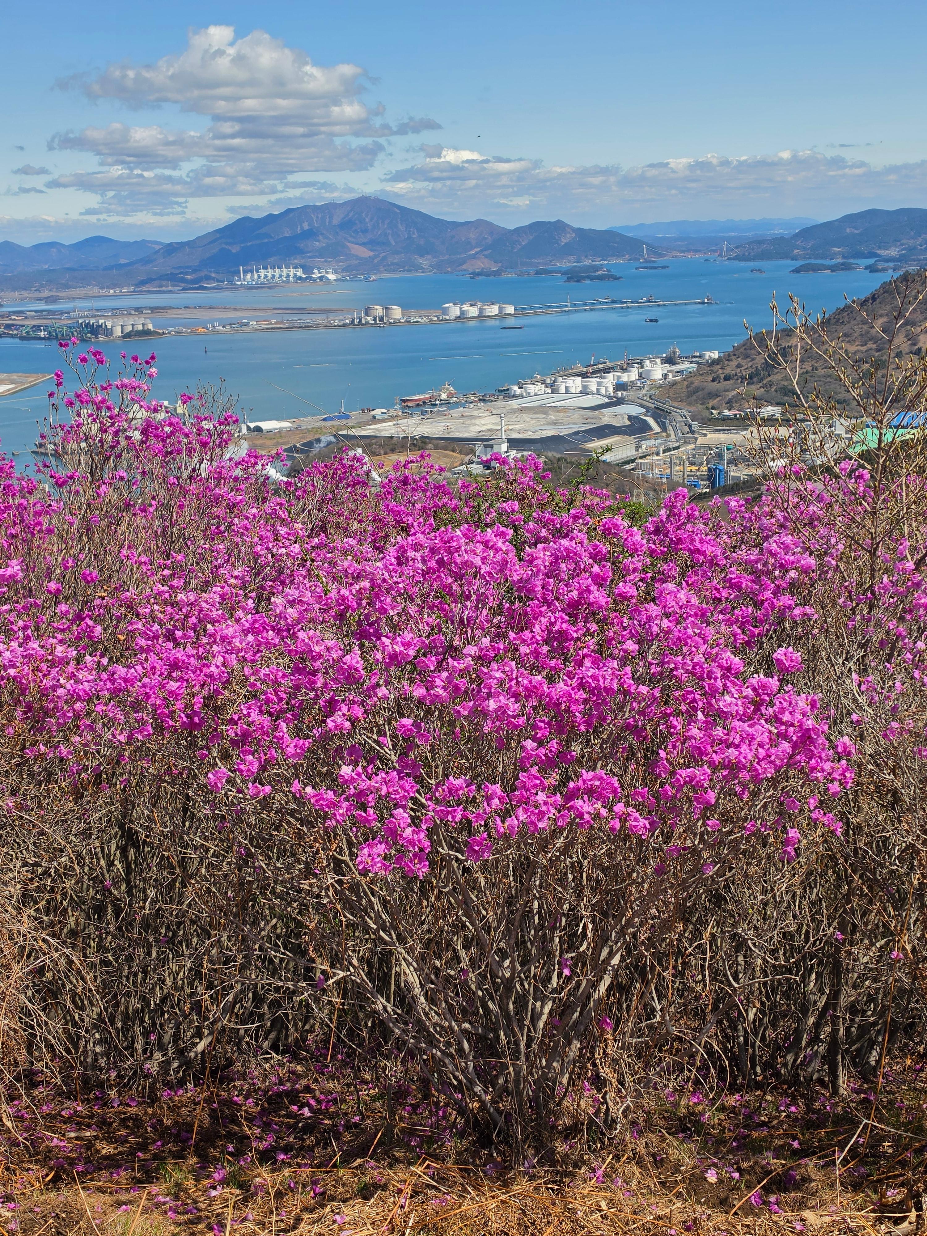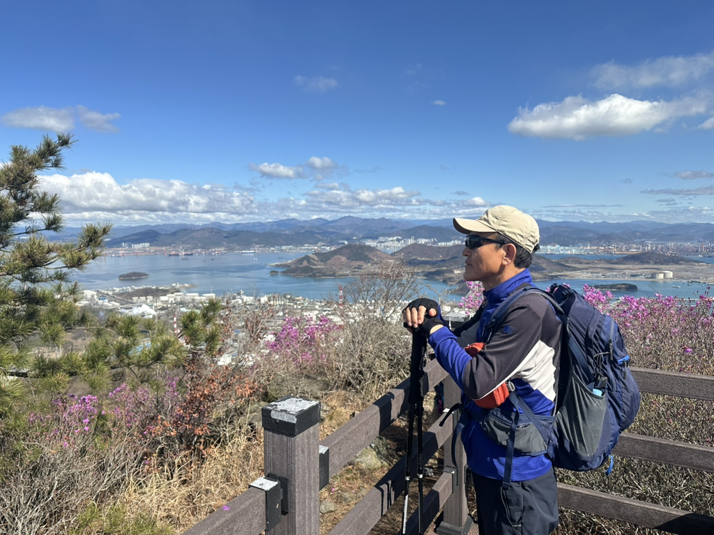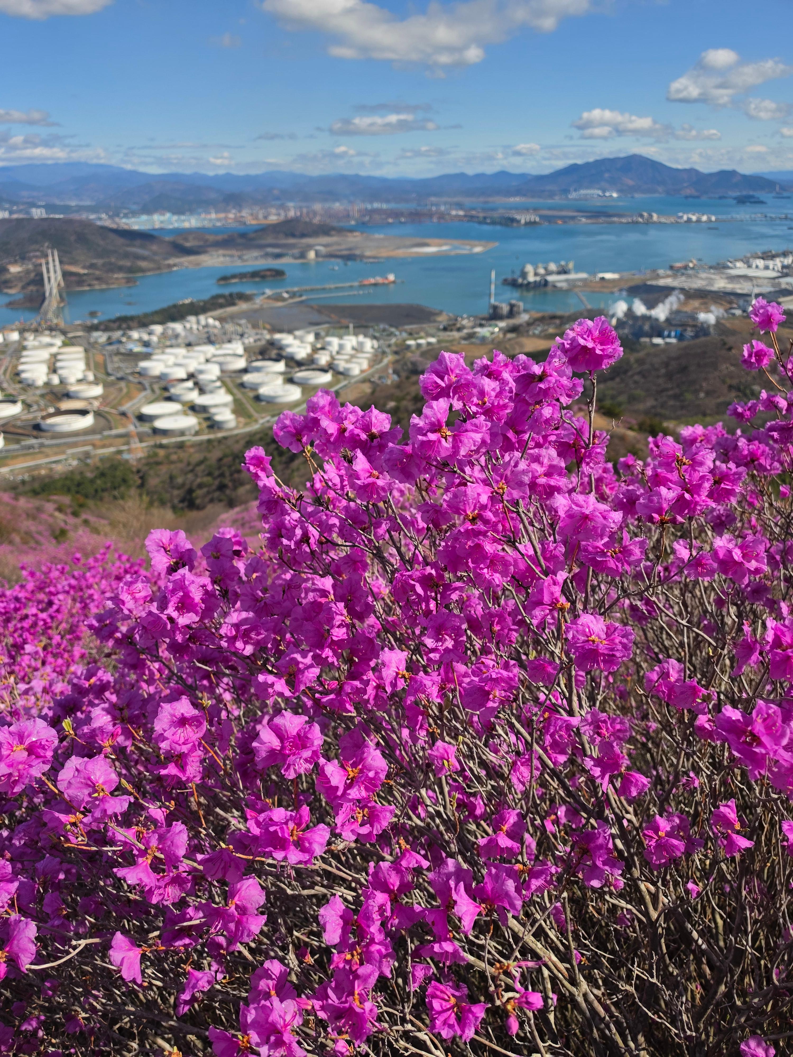○ 최고의 조망터: 가마봉 정상에는 너른 데크 전망대가 설치되어 있어 사방으로 탁 트인 경관을 자랑합니다. 특히 발아래로 펼쳐지는 진달래 군락지와 멀리 묘도대교, 여수 국가산업단지의 이색적인 풍경을 한눈에 담을 수 있습니다.