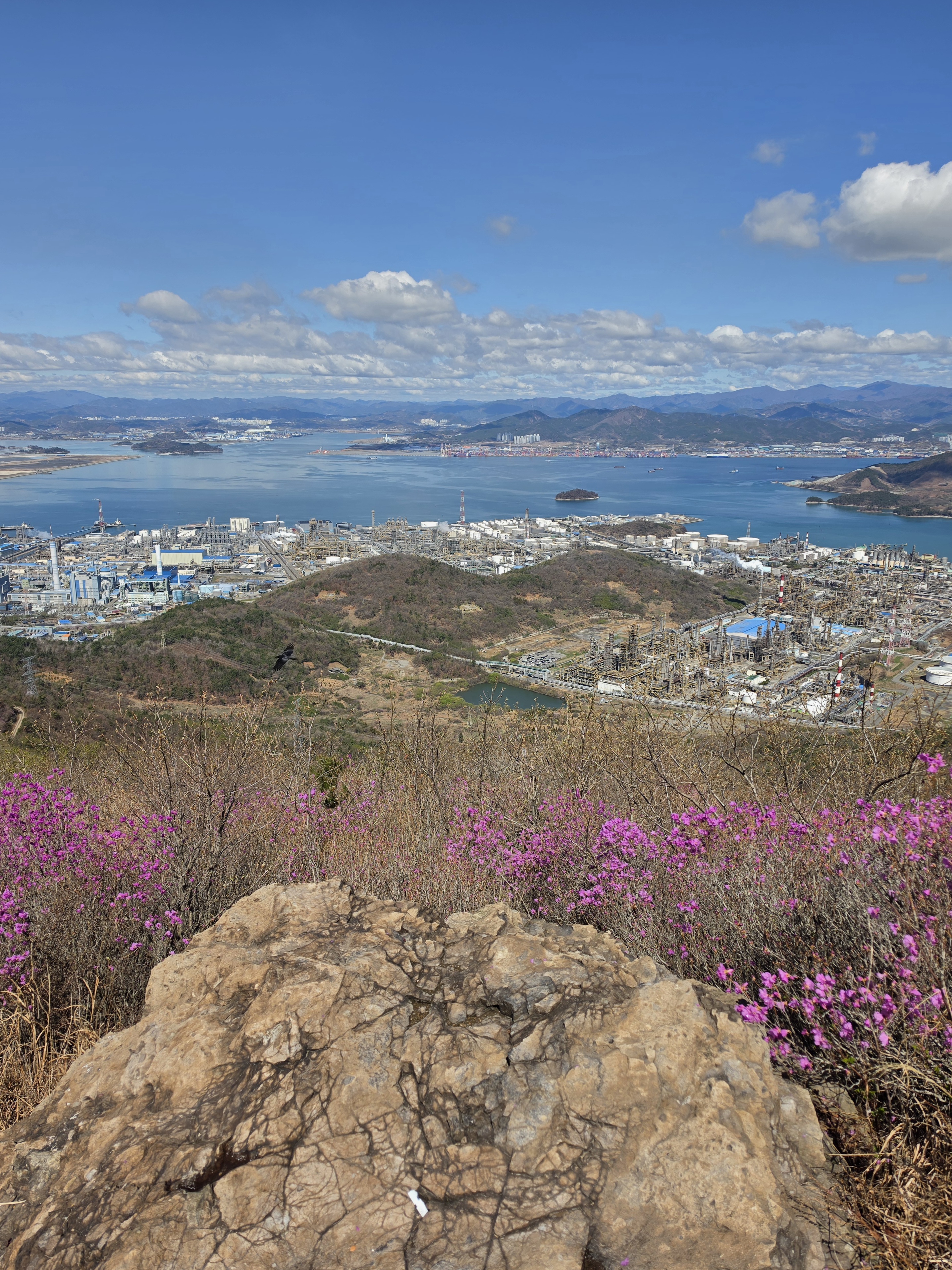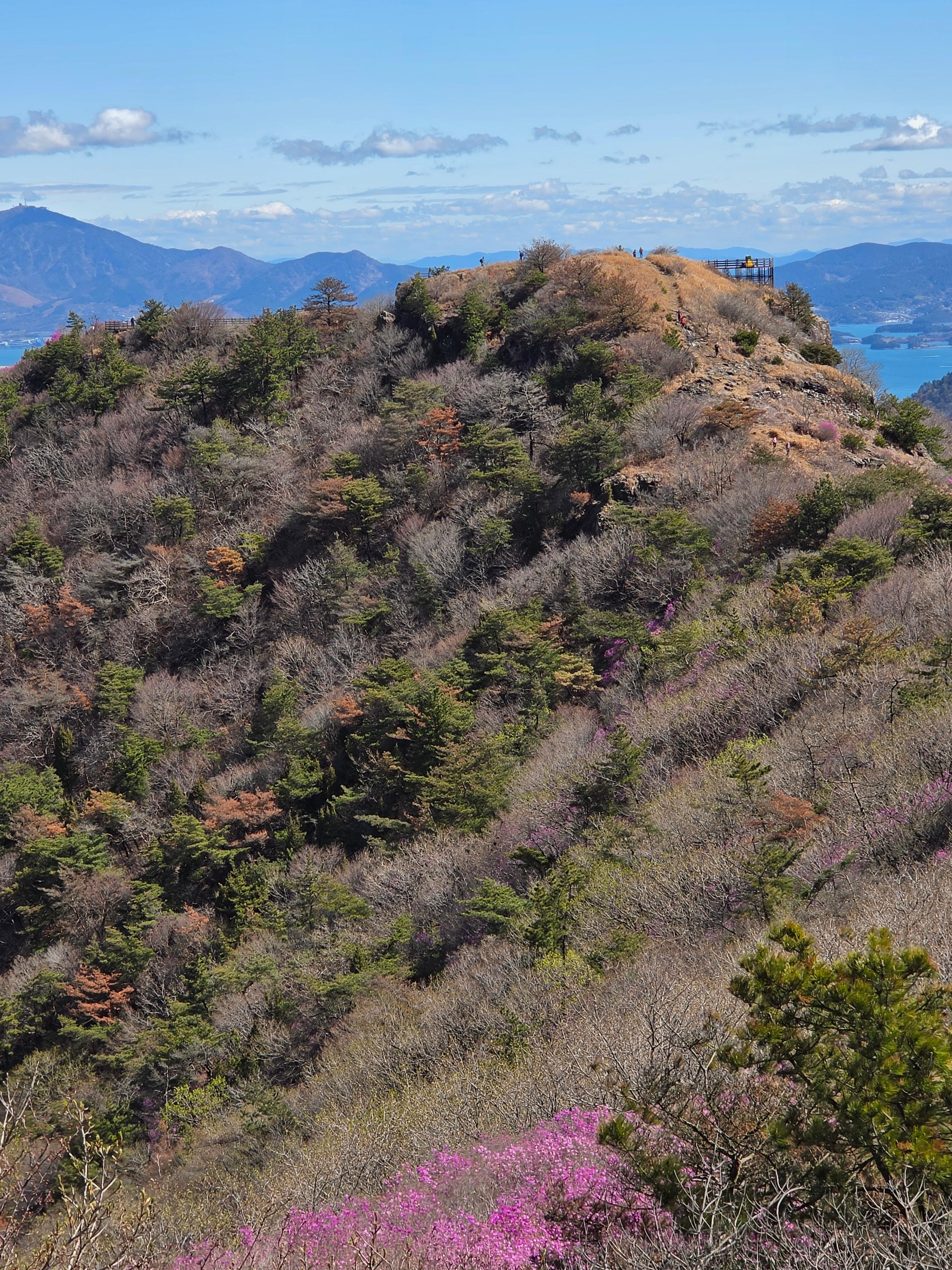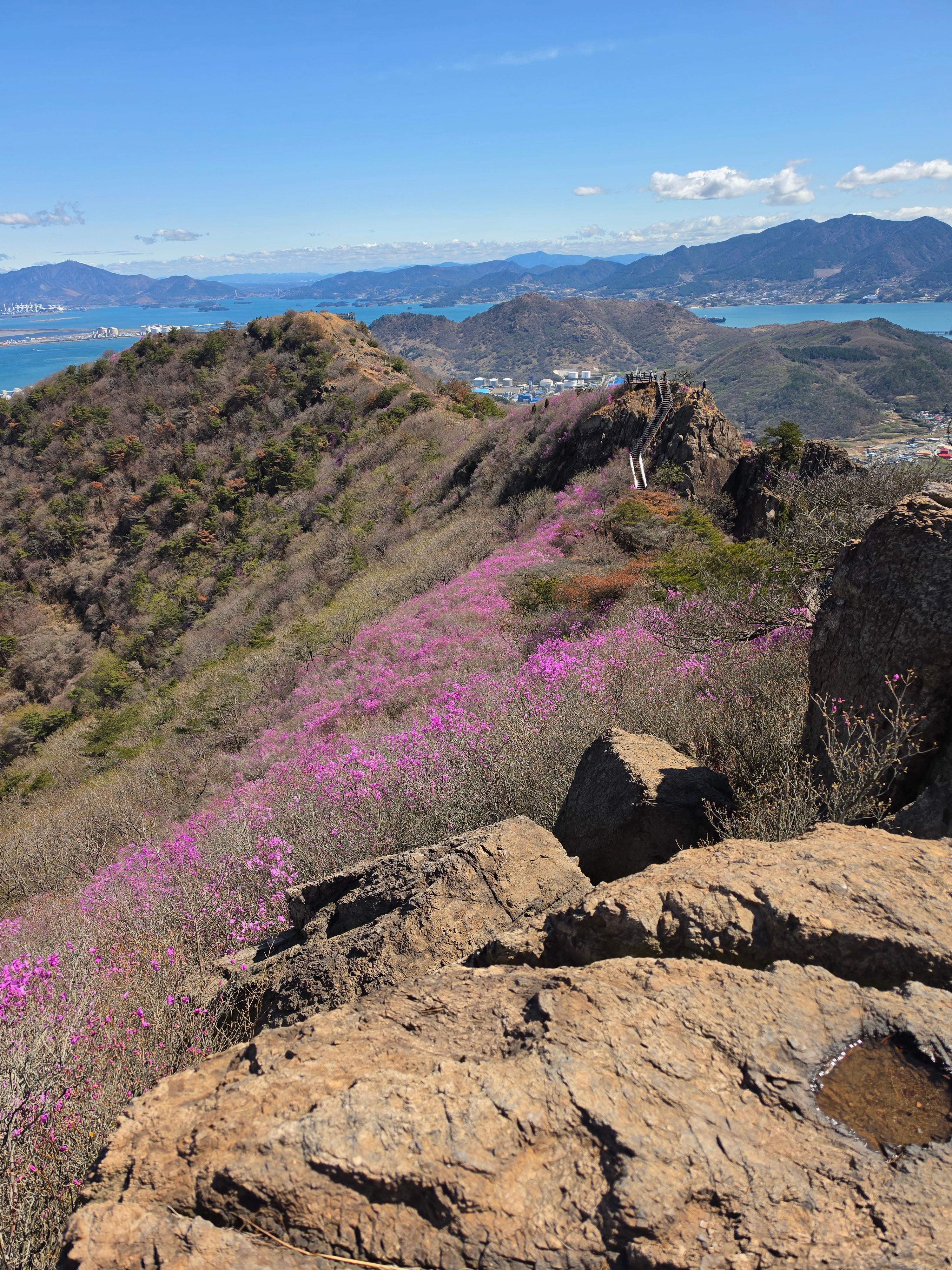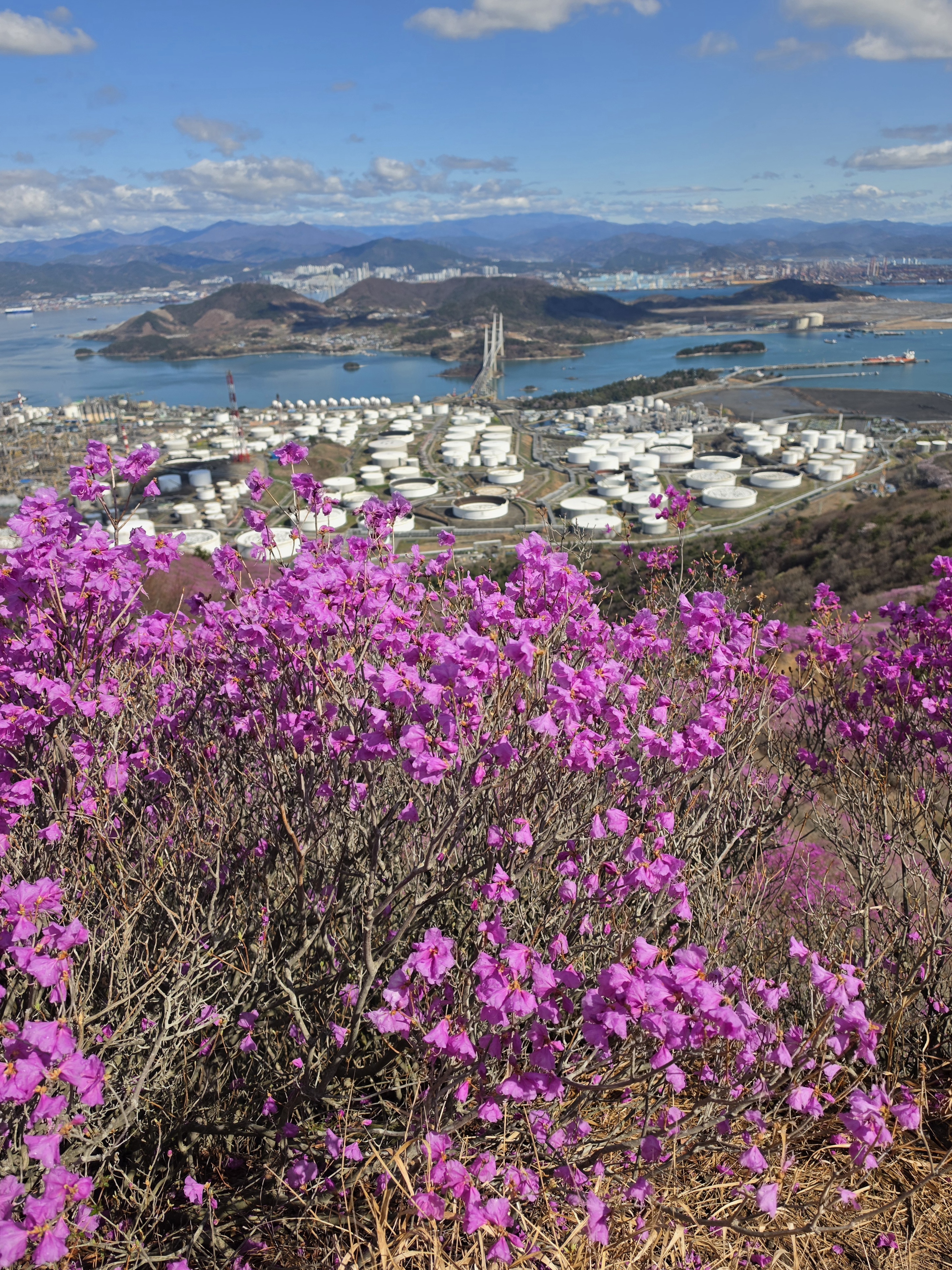 ○ 최고의 조망터: 가마봉 정상에는 너른 데크 전망대가 설치되어 있어 사방으로 탁 트인 경관을 자랑합니다. 특히 발아래로 펼쳐지는 진달래 군락지와 멀리 묘도대교, 여수 국가산업단지의 이색적인 풍경을 한눈에 담을 수 있습니다.