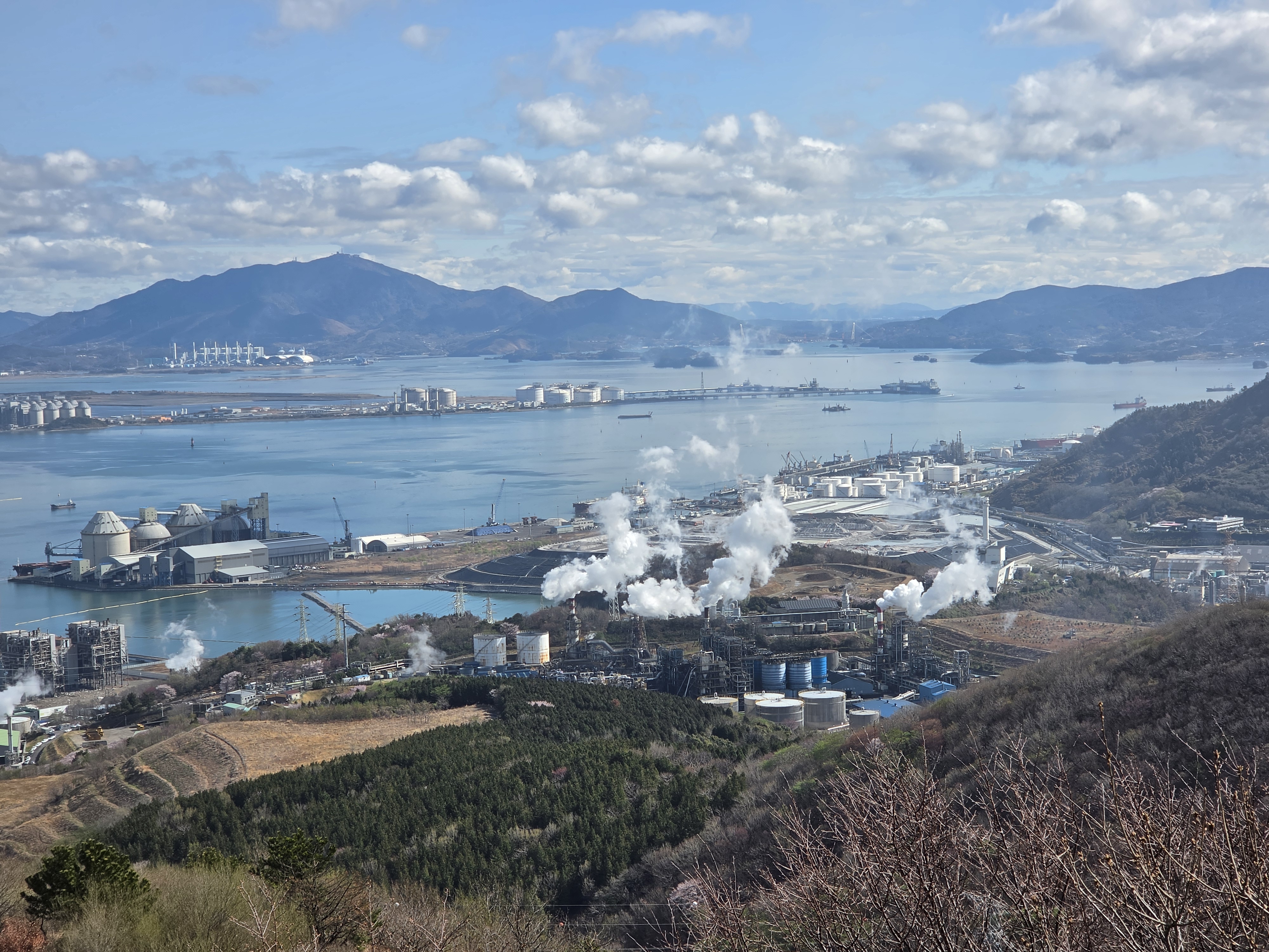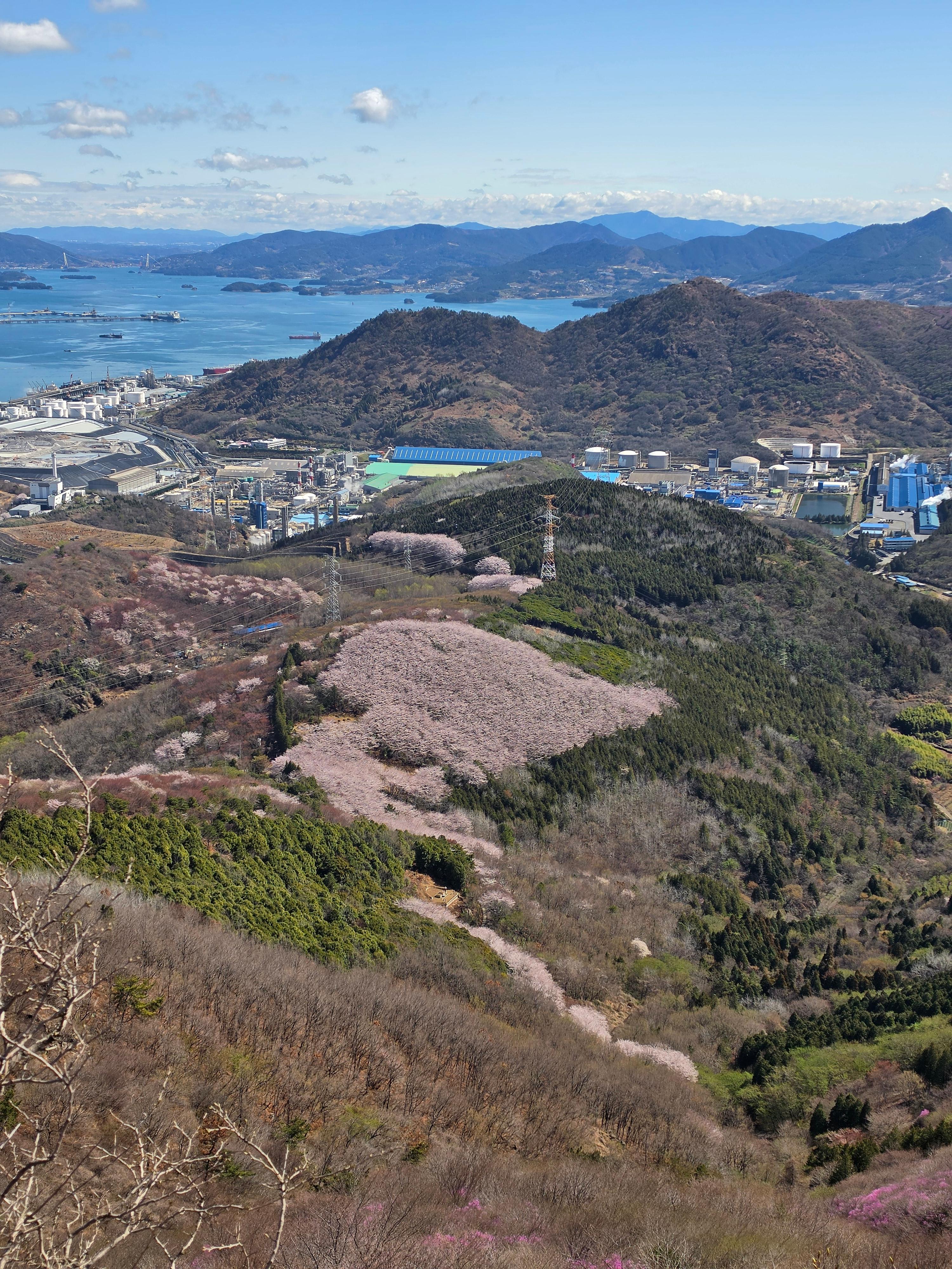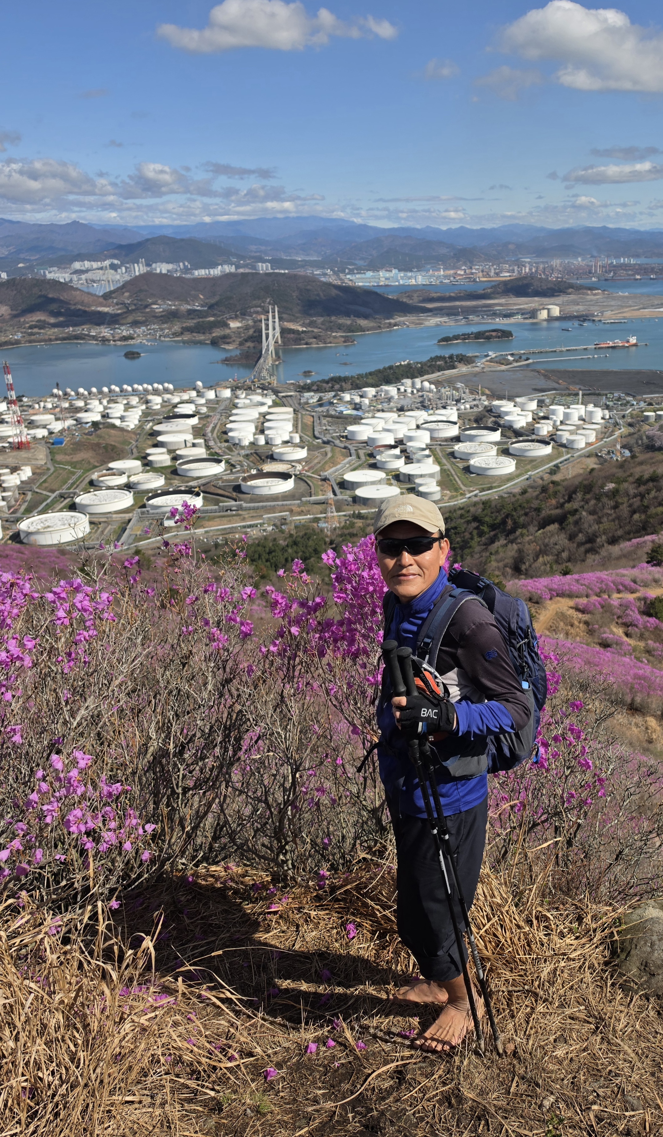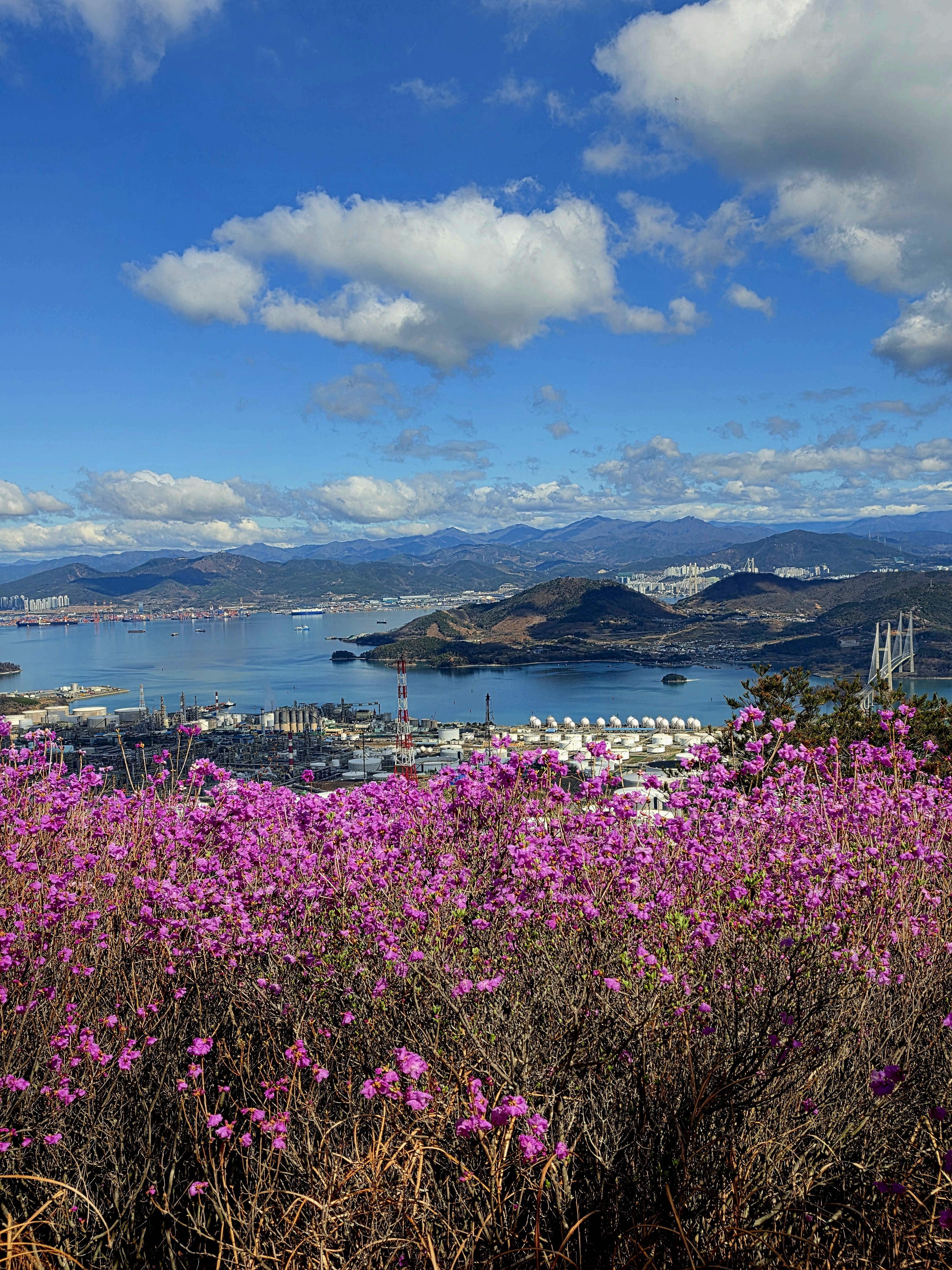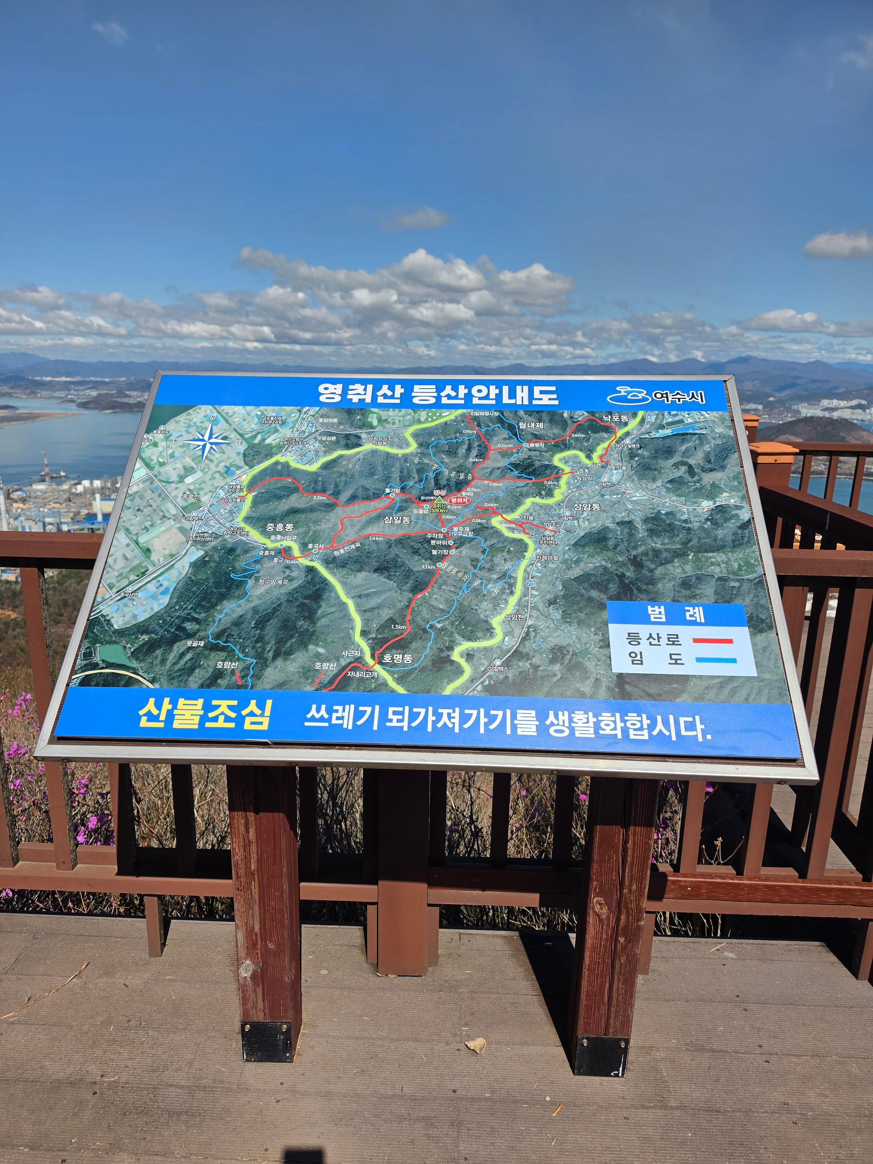 ○ 최고의 조망터: 가마봉 정상에는 너른 데크 전망대가 설치되어 있어 사방으로 탁 트인 경관을 자랑합니다. 특히 발아래로 펼쳐지는 진달래 군락지와 멀리 묘도대교, 여수 국가산업단지의 이색적인 풍경을 한눈에 담을 수 있습니다.