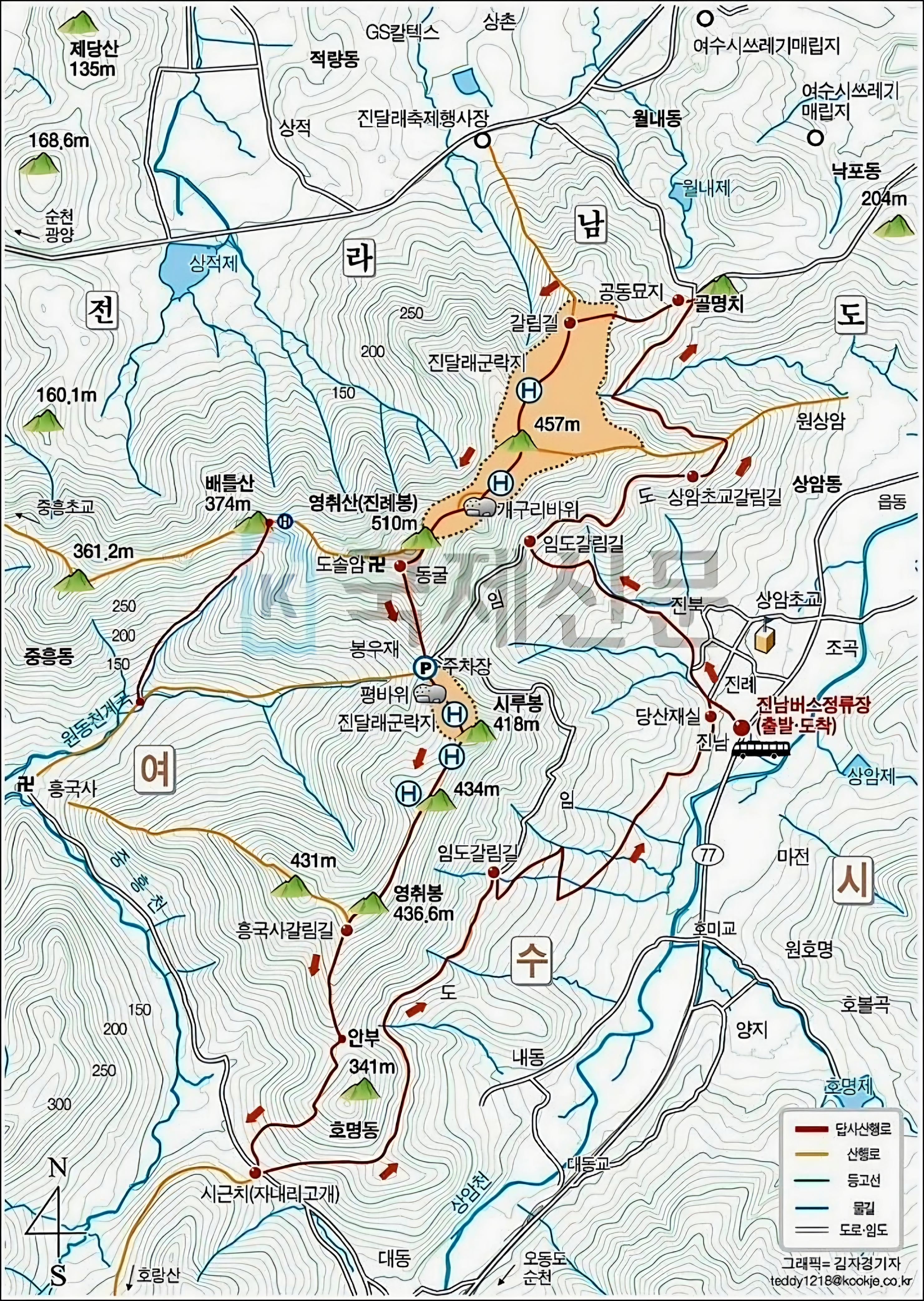 여수 영취산의 **가마봉(457m)**은 진례봉(정상)으로 향하는 길목에서 만나는 핵심 조망처이자, 영취산에서 가장 아름다운 암릉미와 진달래 군락을 동시에 감상할 수 있는 명소입니다.