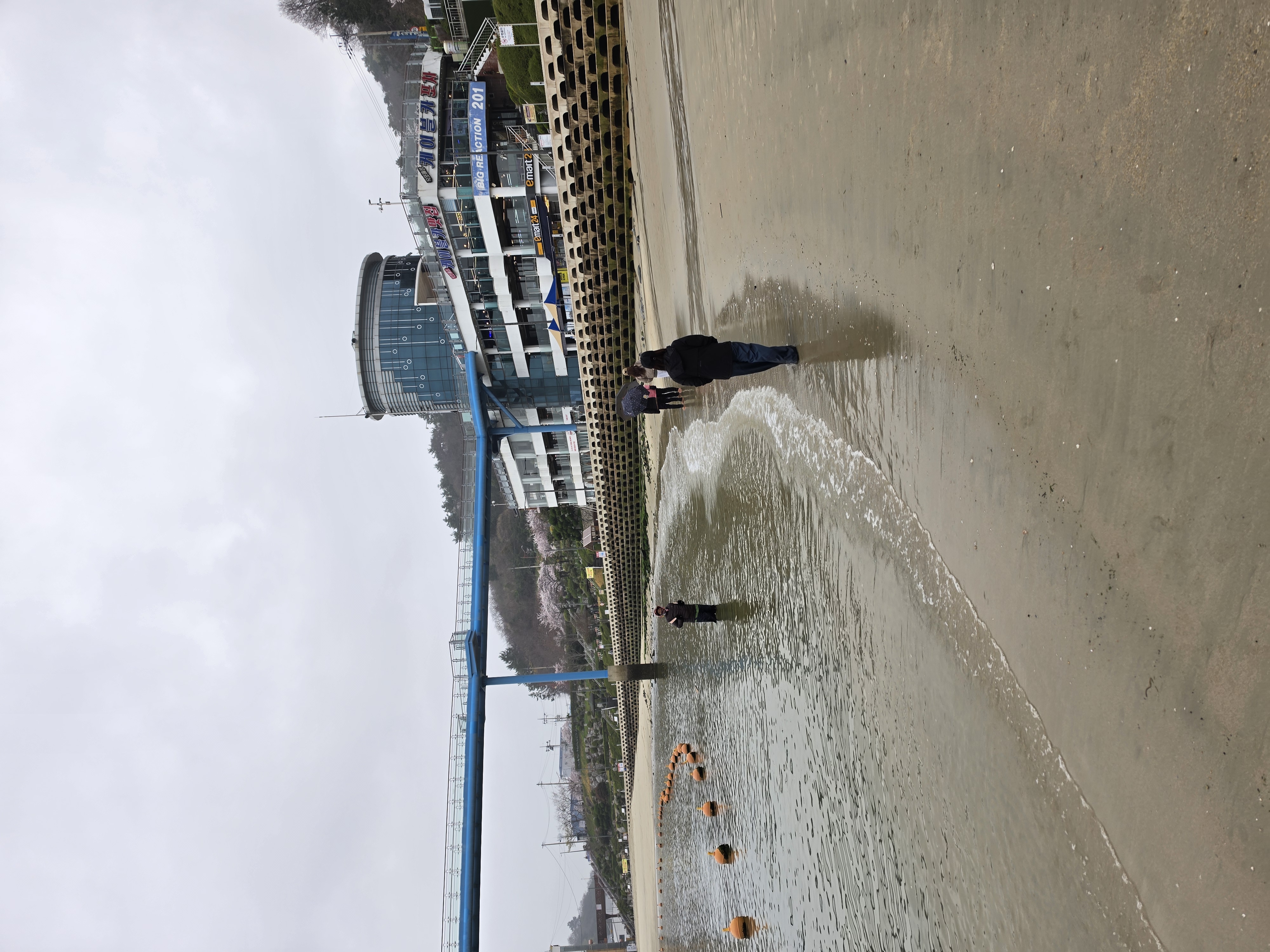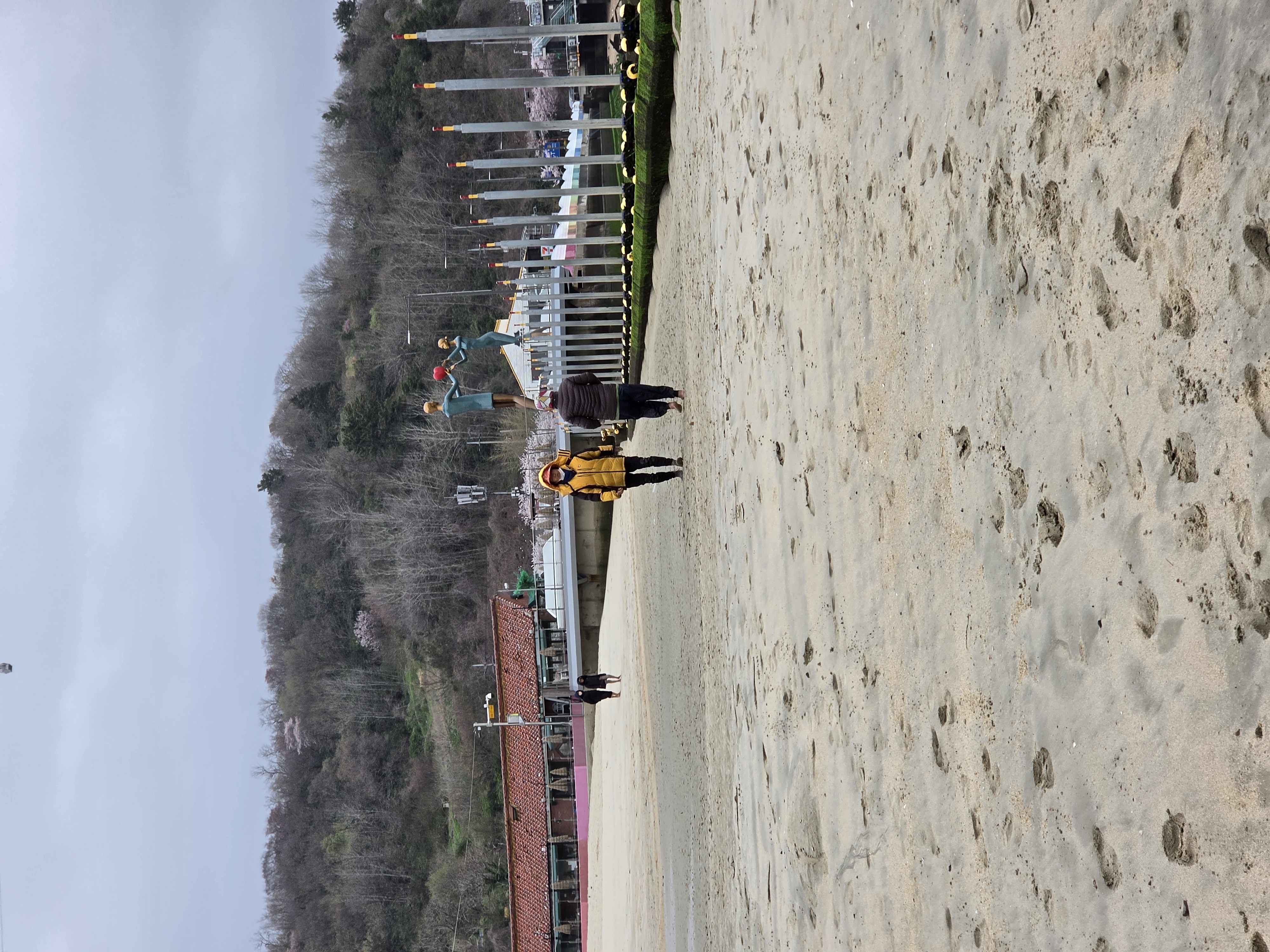 날씨가 흐리고 가끔씩 비가 내리는데도 여러 사람들이 맨발 걷기를 하고 있었다.