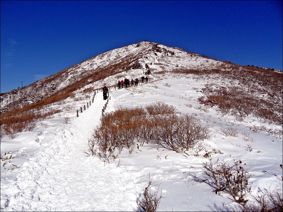 송계 삼거리에서 후미 그룹을 1시간가량 기다리다가 춥고 배가 고파서 점심 식사를 하고 중봉을 거쳐 향적봉으로 향하는데 눈꽃은 거의 볼 수가 없었고 수많은 인파만이 붐빌 뿐이었다. 아쉬움이 남는 산행이었다.